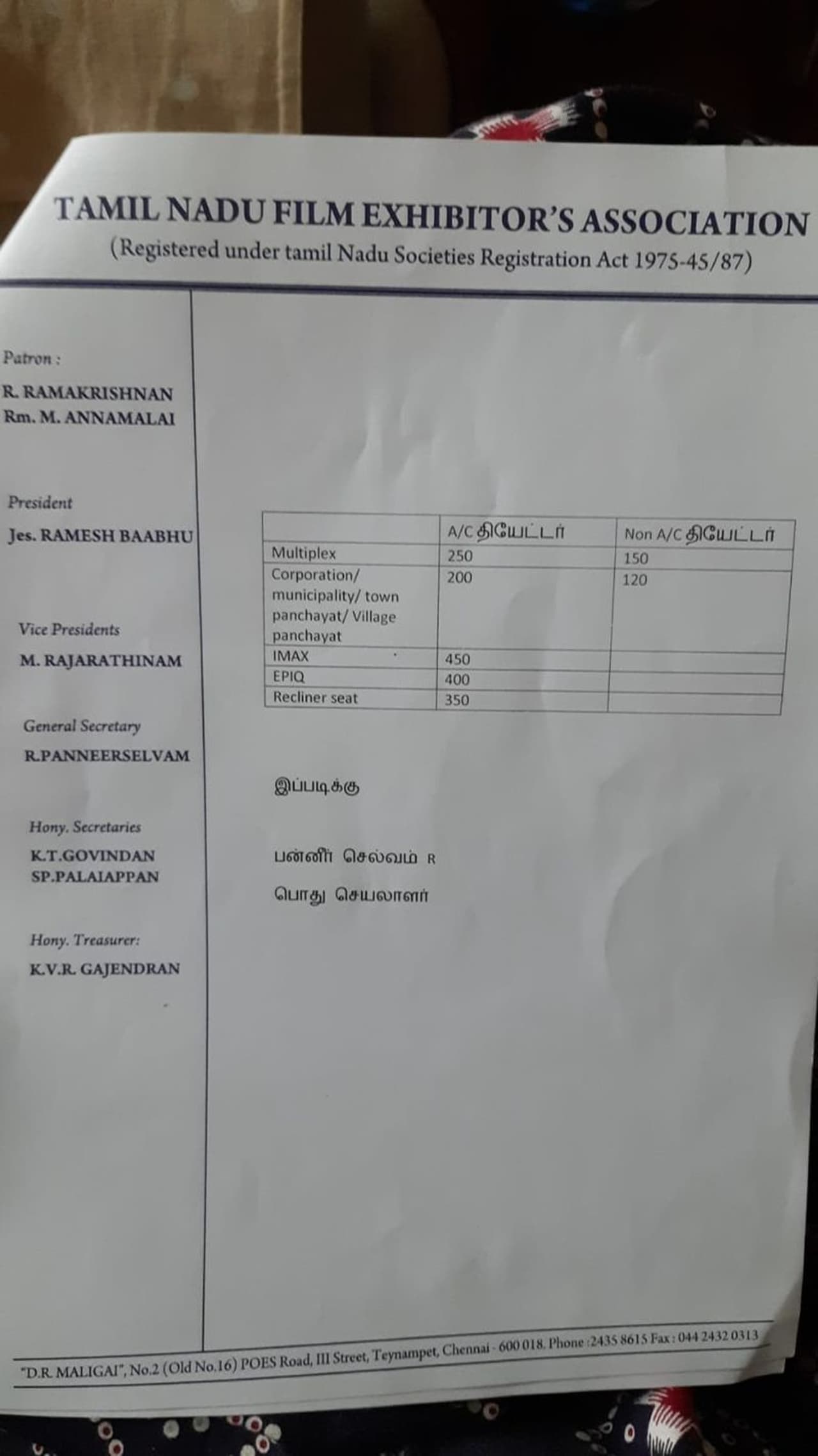 இந்நிலையில் தமிழக அரசுக்கு திரையரங்க உரிமையாளர் சங்கம் சார்பில் பன்னீர்செல்வம் மற்றும் ஸ்ரீதர் உள்ளிட்டோர் மனு அளித்துள்ளனர். அந்த மனுவில் மல்டிபிளக்ஸ் திரையரங்குகளுக்கு 250 ரூபாயாகவும், AC திரையரங்குகளுக்கு 200 ரூபாயாகவும், AC இல்லாத திரையரங்குகளுக்கு 120 ரூபாயாகவும் கட்டணத்தை உயர்த்திக் கொள்ள அரசு அனுமதி வழங்க வேண்டும் என்று கோரிக்கை விடுத்துள்ளனர்.