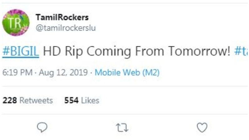 நடிகர் விஜய் போலவே ‘சொல்றதை மட்டுமில்ல சொல்லாததையும் செய்கிற விஷக்கிருமிகள் தமிழ்ராக்கர்ஸ். அவர்களது நேற்றைய ட்விட்டர் பதிவு ஒன்றில், யார் மீது என்ன கோபமோ...நாளை தமிழ்ராக்கர்ஸில் ‘பிகில்’படம் டிஜிட்டல் பிரிண்டில் வெளியாகும் என்று பீதியைக் கிளப்பியுள்ளனர்.