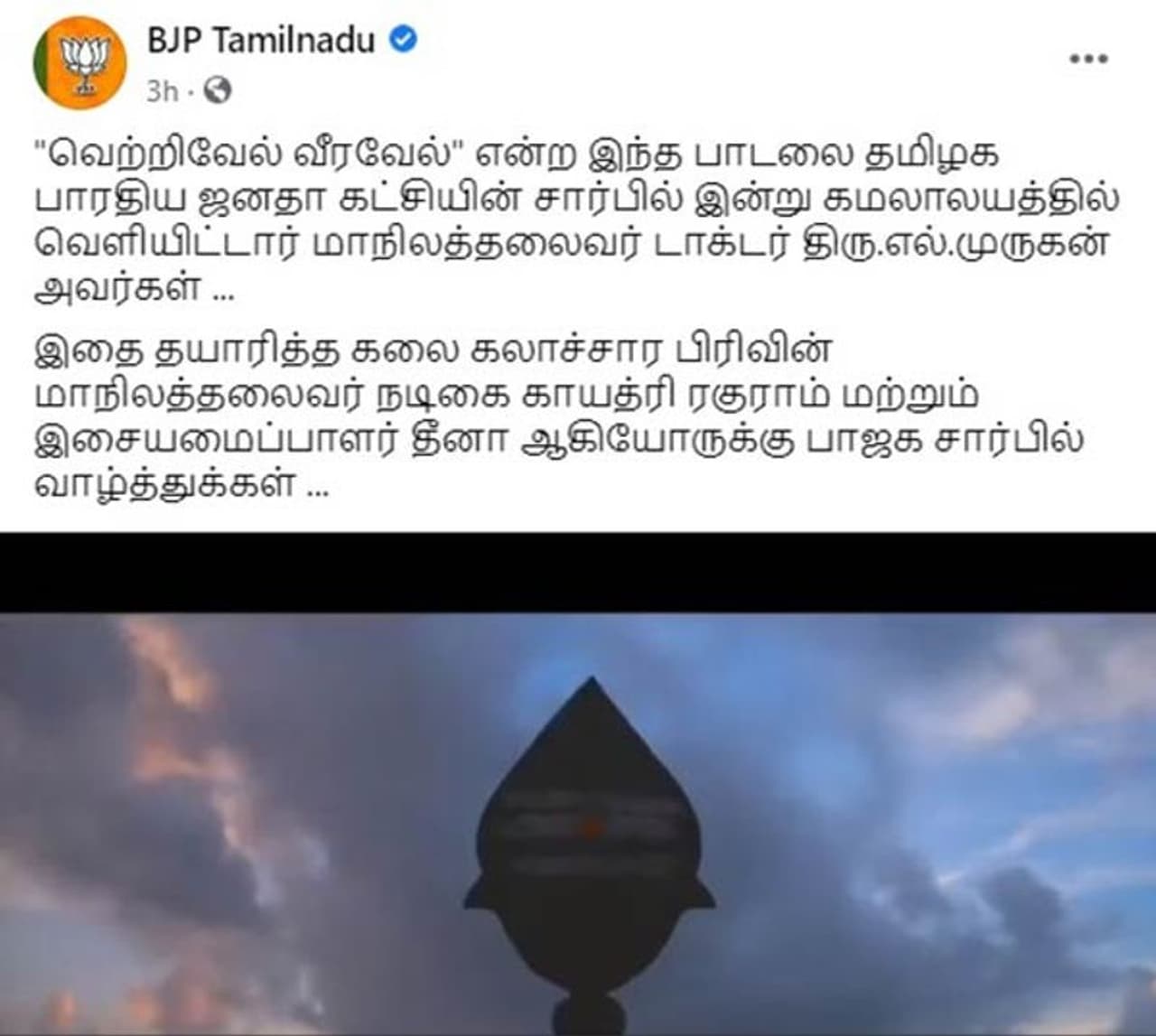 தமிழக அரசின் இந்த அதிரடி நடவடிக்கைகளை சூப்பர் ஸ்டார் ரஜினிகாந்தும் தனது ட்விட்டர் பக்கத்தில் பாராட்டினார். இதனிடையே தமிழக பாஜகவின் முகநூல் பக்கத்தில் வெற்றிவேல் வீரவேல் என்ற பாடல் வெளியிடப்பட்டுள்ளது. தமிழக பாரதிய ஜனதா கட்சி தலைவர் டாக்டர் எல்.முருகன் கமலாலயத்தில் அதனை வெளியிட்டுள்ளார்.