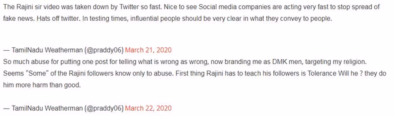 இந்நிலையில் ட்விட்டர் நிர்வாகத்தின் இந்த செயலை பாராட்டி தமிழ்நாடு வெதர்மேன் ப்ரதீப் ஜான் ட்வீட்டை ஒன்றை பதிவிட்டார். அதில், 12 மணி நேரத்தில் கொரோனா வைரஸ் பரவாமல் அழிந்துவிடும் என்பது உண்மைக்கு மாறானது என்றும் உலகில் எங்குமே ஆய்வு ரீதியாக அது நிரூபிக்கப்படவில்லை என்றும், ரஜினியின் பதிவை நீக்கியதற்காக ட்விட்டர் நிறுவனத்துக்கு பாராட்டுத் தெரிவித்திருந்தார். உடனடியாக பொங்கி எழுந்த ரஜினி ரசிகர்கள் தமிழ்நாடு வெதர்மேனை கண்டபடி விமர்சிக்க ஆரம்பித்தனர்.