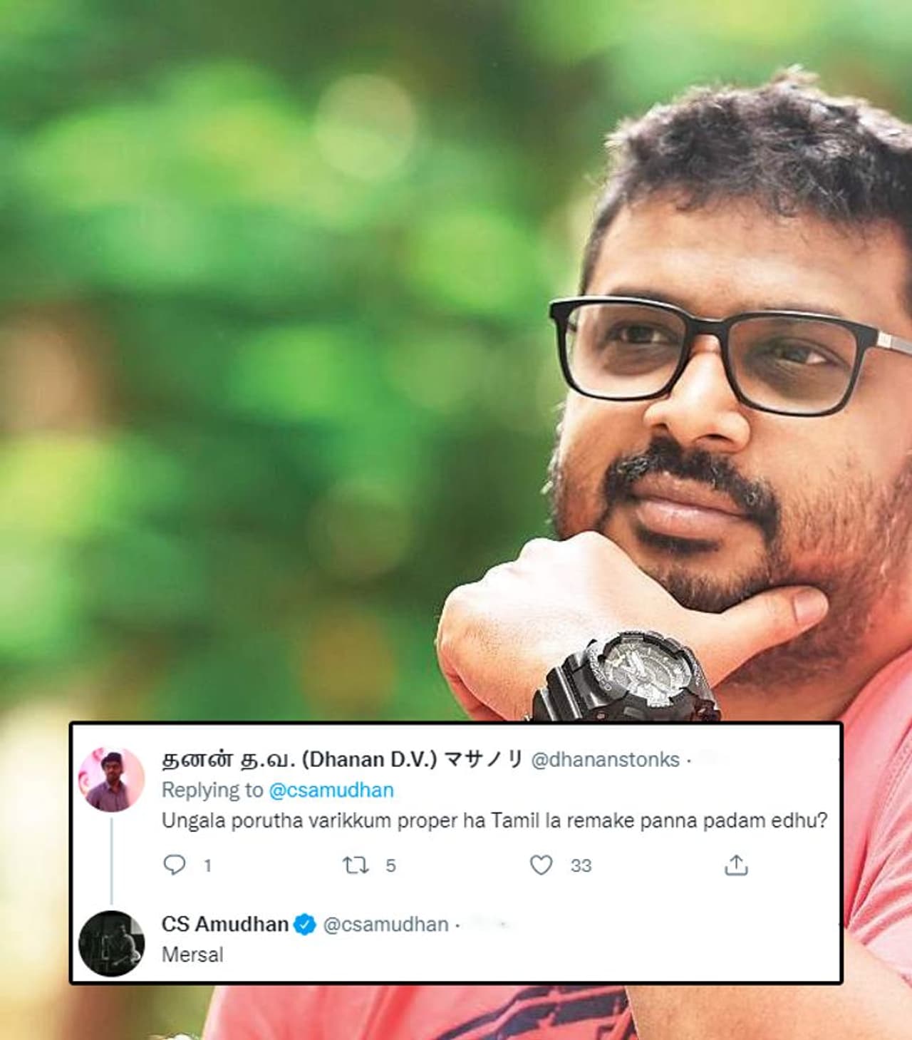 இந்நிலையில் இயக்குனர் அட்லீயை பிரபல இயக்குனர் ஒருவர் ட்ரோல் செய்துள்ளது பரபரப்பை ஏற்படுத்தி உள்ளது. தமிழ் படத்தை இயக்கியதன் மூலம் பிரபலமானவர் சி.எஸ்.அமுதன், இவர் சமீபத்தில் டுவிட்டர் வாயிலாக ரசிகர்கள் கேட்ட கேள்விக்கு பதிலளித்தார். அப்போது ரசிகர் ஒருவர், உங்கள பொறுத்த வரைக்கும் தமிழ்ல சரியா ரீமேக் செய்யப்பட்ட படம் எது என கேள்வி எழுப்பினார். இதற்கு மெர்சல் என பதிலளித்துள்ளார் அமுதன். இதன்மூலம் அவர் இயக்குனர் அட்லீயை மறைமுகமாக கலாய்த்துள்ளார்.