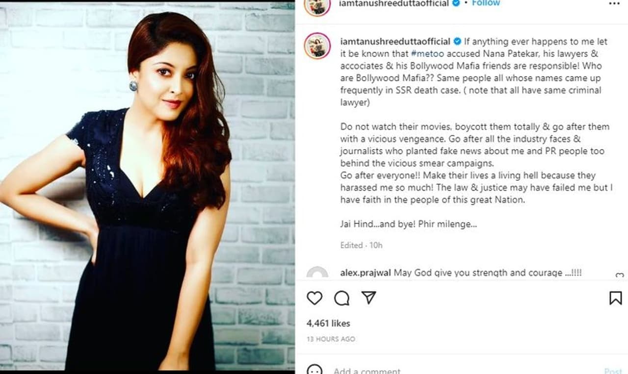 பாலிவுட் மாஃபியா கும்பல் என்றால், நடிகர் சுஷாந்த் சிங்கின் மரணத்தின் போது ஒருசிலரின் பெயர்கள் வெளியே வந்ததே அவர்கள் தான். என்னை துன்புறுத்திய அவர்களின் வாழ்க்கையை நரகமாக்குமாறும், சட்டம் தன் பக்கம் துணை நிற்காமல் போனாலும், மக்கள் மீது தனக்கு அதிக நம்பிக்கை இருப்பதாகவும் தனுஸ்ரீ அந்த பதிவில் குறிப்பிட்டுள்ளார். நடிகர் நானா படேகர் ரஜினியின் காலா படத்தில் வில்லனாக நடித்தவர் என்பது குறிப்பிடத்தக்கது.