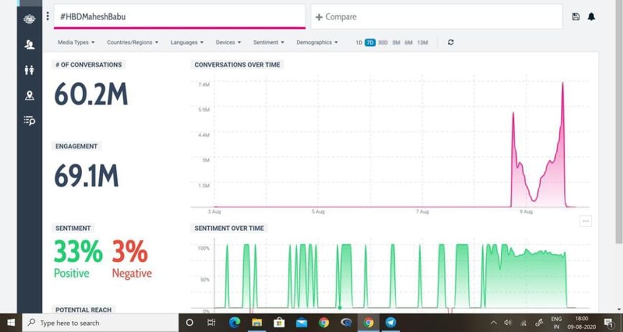 கடந்த சில மாதங்களுக்கு முன்பு கூட மெகா ஸ்டார் சிரஞ்சீவியே கடுப்பாகும் அளவிற்கு தெலுங்கு மற்றும் தமிழ் டாப் ஸ்டார்களின் ரசிகர்கள் கேவலமாக ட்விட்டரில் கட்டி உருண்டனர். இந்நிலையில் கடந்த 9ம் தேதி தெலுங்கு திரையுலகின் சூப்பர் ஸ்டாரான மகேஷ்பாபுவின் 45வது பிறந்தநாளை அவரது ரசிகர்கள் மிக பிரம்மாண்டமாக கொண்டாடினார்கள். உலக அளவில் ட்ரெண்டான #HBDMaheshBabu என்ற ஹேஷ்டேக் டேக்கில் 24 மணி நேரத்தில் 27.3 மில்லியன் ட்விட்கள் பதிவாகி இருப்பது குறிப்பிடத்தக்கது. மேலும் மொத்தமாக 60.2 மில்லியன் ட்விட்கள் பதிவாகி உலக அளவில் சாதனை படைத்துள்ளன.