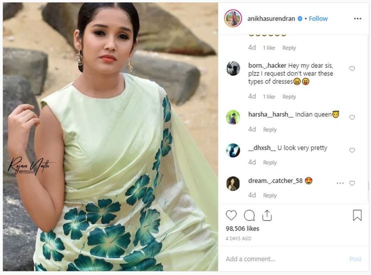 சமீபத்தில் கடற்கரையில் புடவை அணிந்த படி விதவிதமான போஸ் கொடுத்து போட்டோ ஷூட் நடத்தியிருந்தார் அனிகா. அந்த புகைப்படங்களை தனது இன்ஸ்டாகிராம் பக்கத்தில் பதிவேற்றியிருந்தார். அதைப் பார்த்த ரசிகர்கள், "18 வயசிக்கு கீழ இருக்குற நீங்க ஏன் இப்படி கிளாமர் போட்டோ ஷூட் எடுக்குறீங்க, இப்படி எல்லாம் பண்ணாதீங்க" என அட்வைஸ் செய்து வருகின்றனர்.