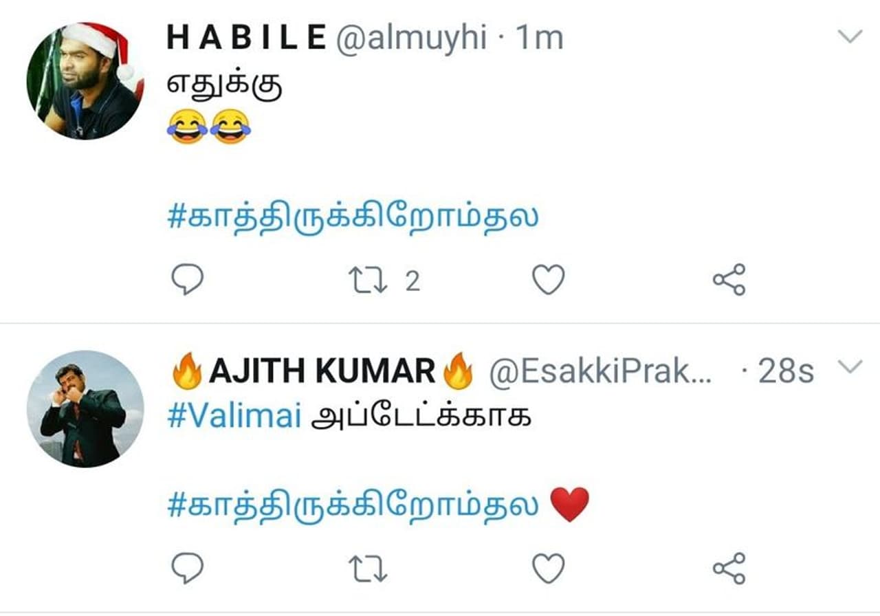 இதனால் கடுப்பான அஜித் ரசிகர்கள் சுரேஷ் சந்திராவை மாற்றும் படி #thalachangeyourpro என்ற ஹேஷ்டேக்கை உருவாக்கி ட்ரெண்ட் செய்தனர். புத்தாண்டில் வலிமை படம் குறித்து அசத்தல் அப்டேட் ஒன்று வெளியாக உள்ளதாக இயக்குநர் ஹெச்.வினோத் தெரிவித்திருந்தார். இதனால் குஷியான ரசிகர்கள் புத்தாண்டு அன்று தல பட அப்டேட்டை கொண்டாட காத்திருக்கிறார்களாம்... அதை தெரிவிக்கவே #காத்திருக்கிறோம்தல என்ற ஹேஷ்டேக்கை ட்விட்டரில் ட்ரெண்ட் செய்து வருகின்றனர்.