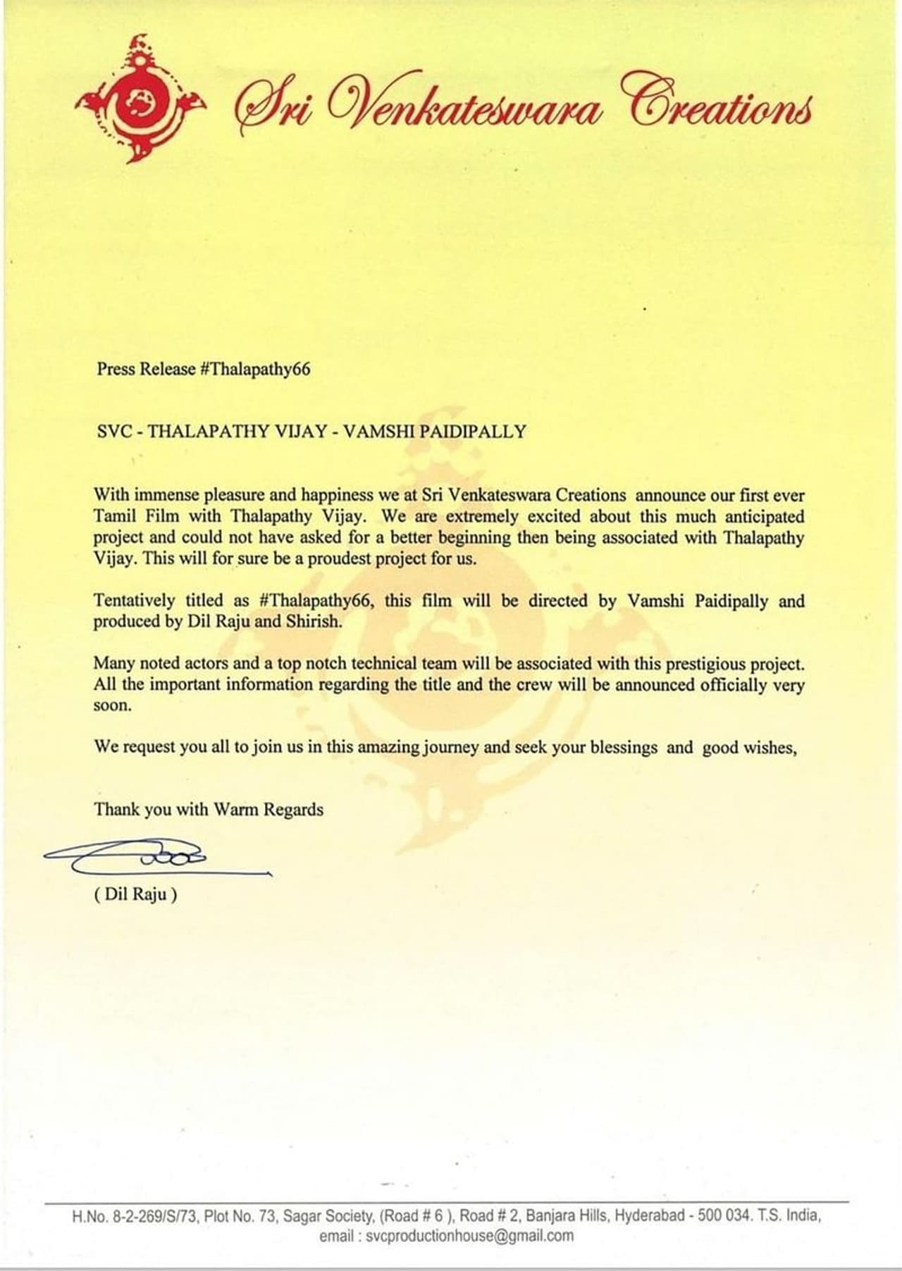 மேலும் ஸ்ரீ வெங்கடேஸ்வரா கிரியேஷன்ஸ் வெளியிட்டுள்ள அறிக்கையில், தளபதி விஜய்யுடன் முதல் முறையாக இணைவது மகிழ்ச்சி என்றும், இந்த படம் குறித்த மற்ற முக்கிய தகவல்கள் விரைவில் வெளியாகும் என அறிவிக்கப்பட்டுள்ளது. உங்கள் அனைவரது வாழ்த்துக்களுடன் விரைவில் இப்படம் துவங்கும் என தெரிவிக்கப்பட்டுள்ளது.