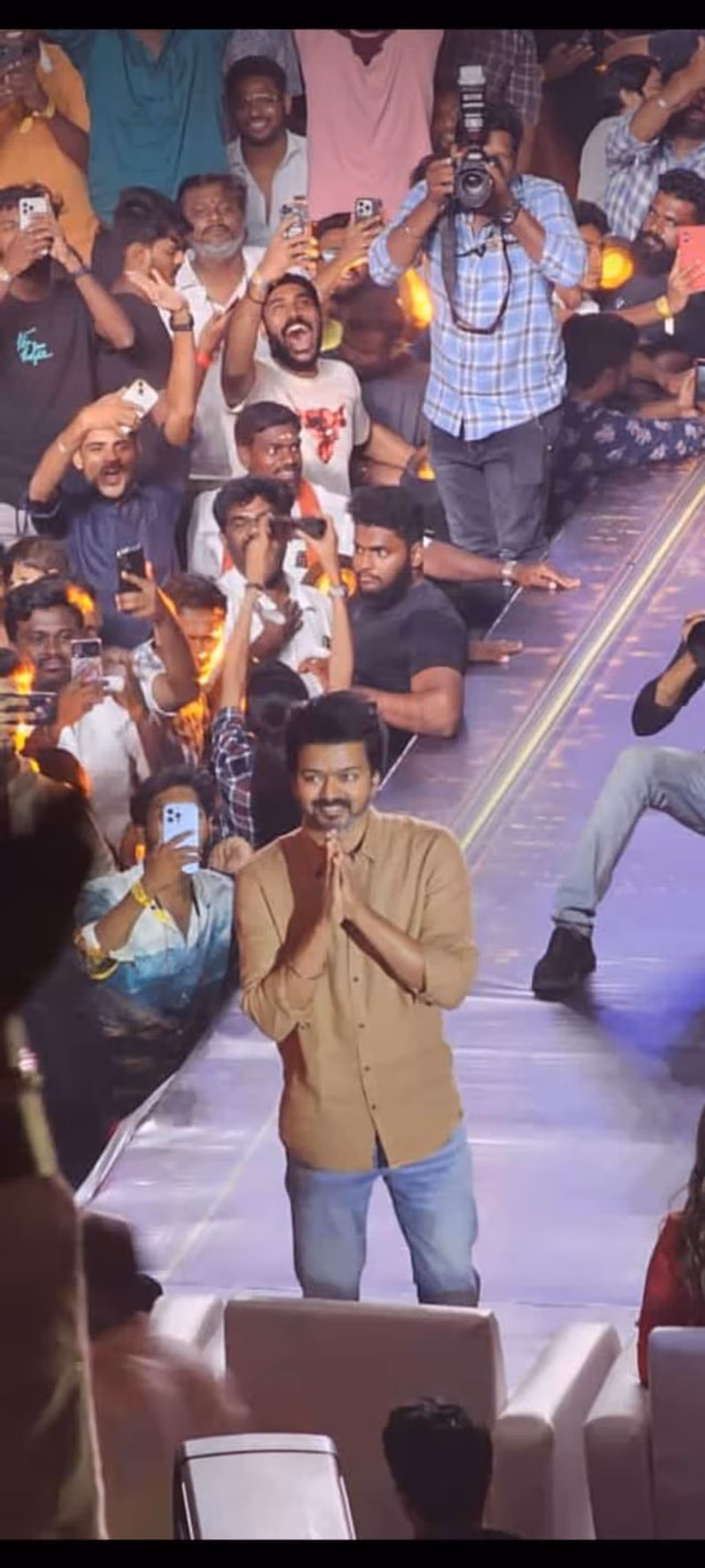 சற்று முன்னர் தளபதி விஜயும் 'லியோ' சக்ஸஸ் மீட்டுக்கு வருகை தந்தார். நிகழ்ச்சி துவங்கப்படுவதாக அறிவித்த 6 மணியில் இருந்தே எப்போது தளபதியின் தரிசனம் கிடைக்கும் என காத்திருந்த ரசிகர்கள், விஜய் உள்ளே... என்ட்ரி கொடுத்தபோது, அரங்கமே அதிர வைக்கும் அளவுக்கு கைகளை தட்டியும், தளபதி என கத்தியும் வரவேற்றனர். மேலும் இருபக்கமும் ஃபயர் தெறிக்க, டான்ஸர்ஸ் நடனமாடி தளபதியை செம்ம மாஸாக வரவேற்றனர். இதுகுறித்த வீடியோஸ் தற்போது வைரலாகி வருகிறது.