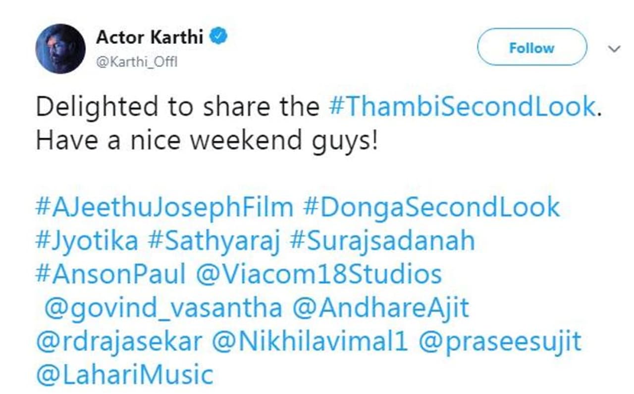 அத்துடன் ரசிகர்களின் லைக்குகளையும் குவித்து வருகிறது.முதல்முறையாக கார்த்தி, ஜோதிகா இணைந்து நடிக்கும் படம் - தமிழில் ஜீத்து ஜோசப் இயக்கும் 2-வது படம் என எக்கச்சக்க எதிர்பார்ப்புகளை ஏற்படுத்தியுள்ள 'தம்பி' படம், டிசம்பர் வெளியீடாக திரைக்குவரவுள்ளது.