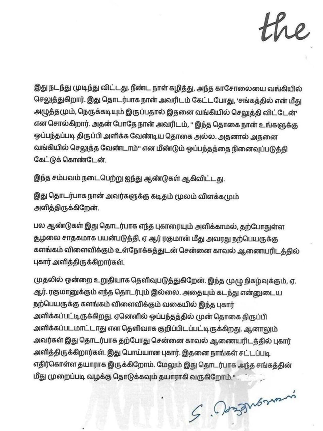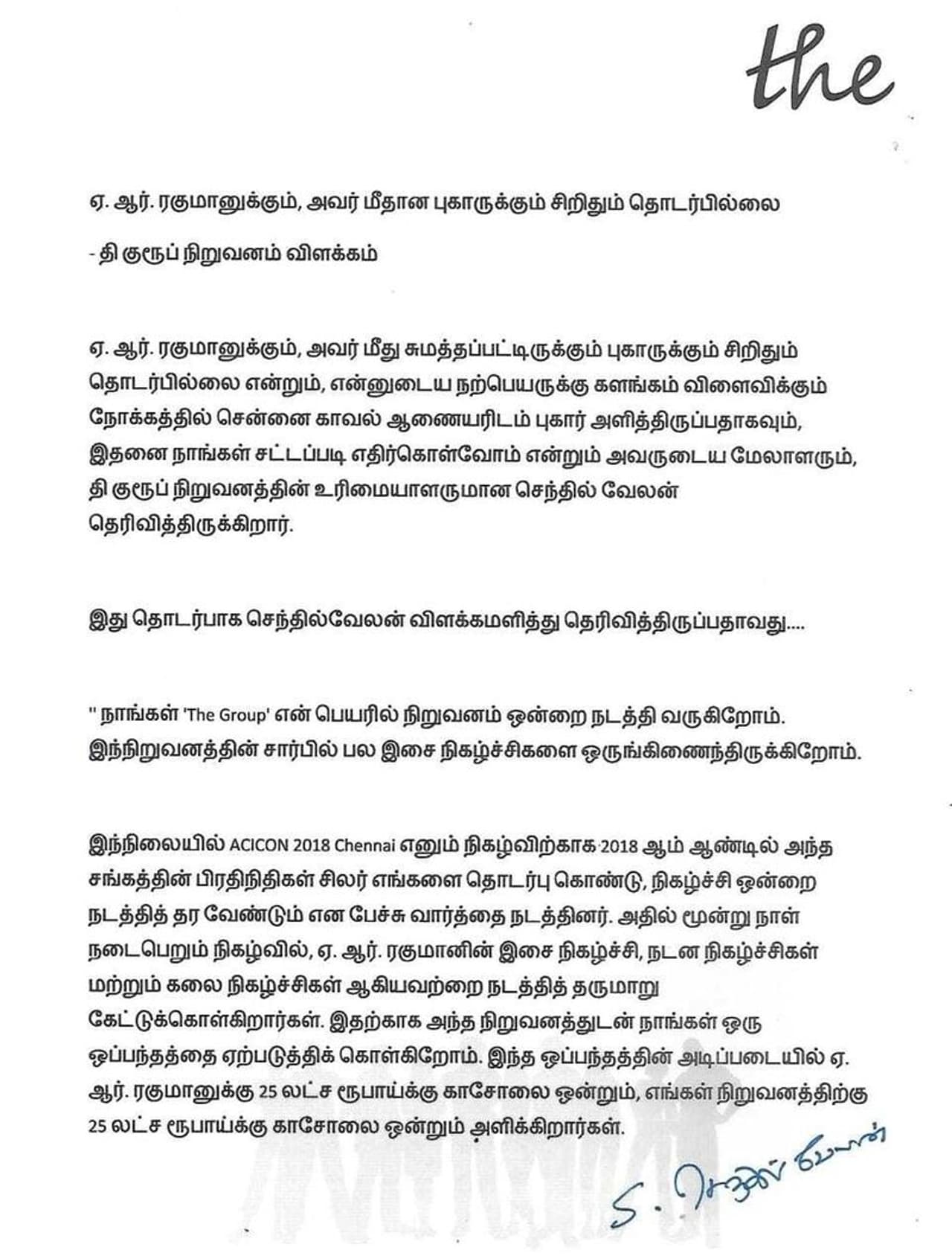 அதில், கடந்த 2018ம் ஆண்டு "ASICON 2018 Chennai" என்ற மூன்று நாள் நிகழ்வுக்காக ஏ.ஆர். ரகுமான் இசை நிகழ்ச்சி மற்றும் வேறு சில நிகழ்ச்சிகளை நடத்துவதற்காக எங்கள் நிறுவனத்தை தொடர்பு கொண்டார்கள். நாங்கள் ஏ.ஆர். ரகுமானிடம் பேசி அனுமதி பெற்றோம். இதன்பின் நிகழ்ச்சி நடத்துவதற்கான ஏற்பாடுகளை செய்தோம். அப்போது ஏ.ஆர். ரகுமான் இசை நிகழ்ச்சிக்காக அவரின்