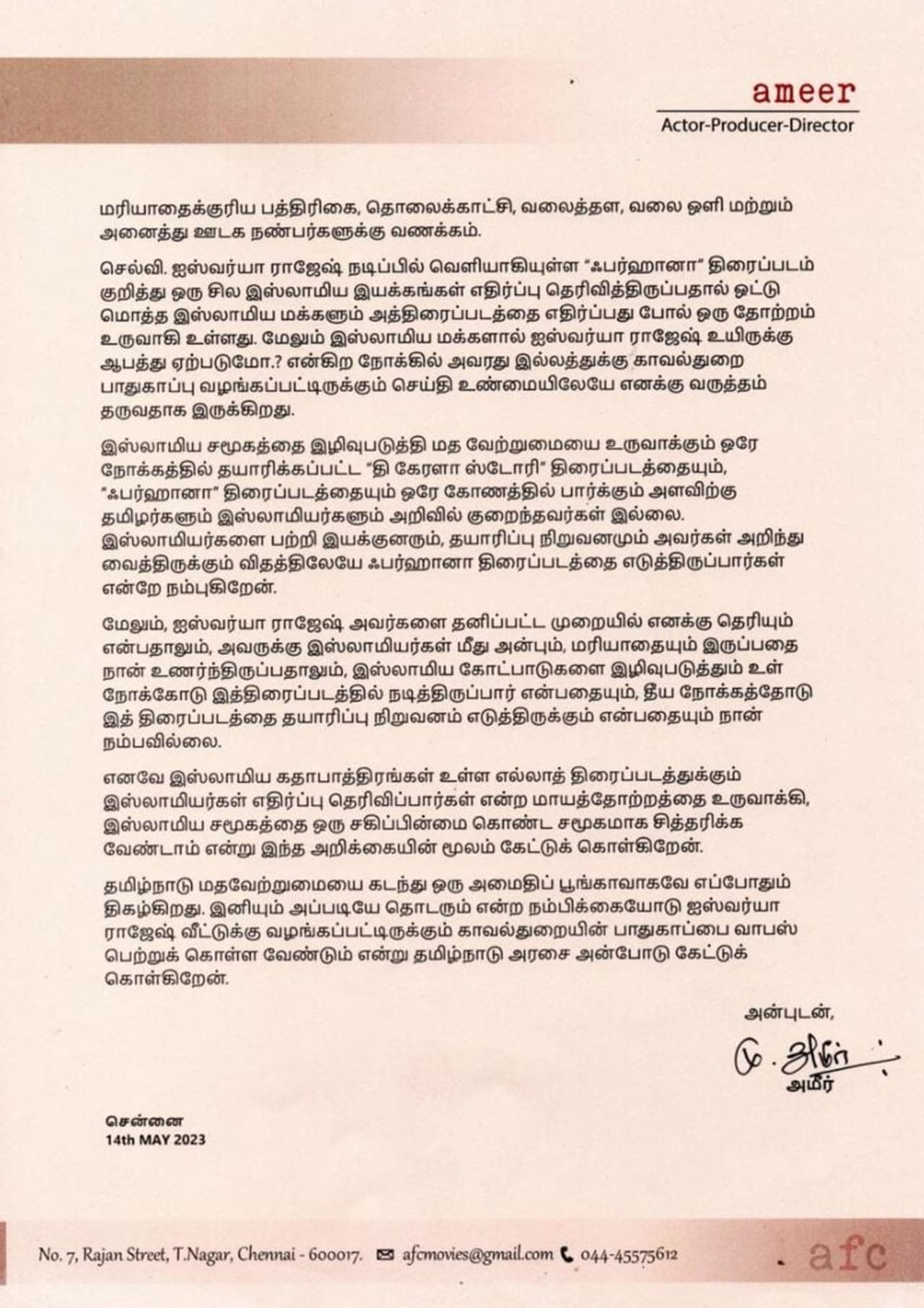 தமிழ்நாடு மதவேற்றுமையை கடந்து ஒரு அமைதிப் பூங்காவாகவே எப்போதும் திகழ்கிறது. இனியும் அப்படியே தொடரும் என்ற நம்பிக்கையோடு ஐஸ்வர்யா ராஜேஷ் வீட்டுக்கு வழங்கப்பட்டிருக்கும் காவல்துறையின் பாதுகாப்பை வாபஸ் பெற்றுக் கொள்ள வேண்டும் என்று தமிழ்நாடு அரசை அன்போடு கேட்டுக் கொள்கிறேன்” என்று தெரிவித்துள்ளார் அமீர்.