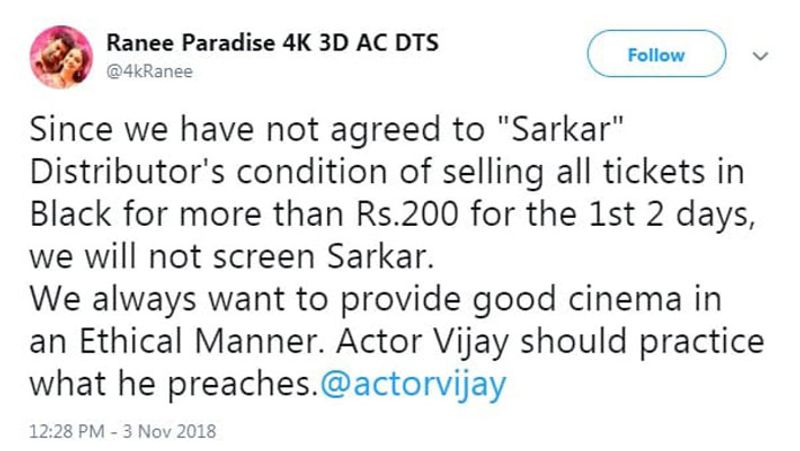 ’சர்கார்’படத்தின் டிக்கெட் விலை முதல் இரண்டு நாட்களுக்கு அரசு ஆணையையும் மீறி 2000முதல் 5000 ரூபாய் வரை விற்கப்படுகிறது. இது குறித்து வெளிப்படையாக ட்வீட் பண்ணியுள்ள தஞ்சாவூர் ராணி பேரடைஸ் தியேட்டர் நிர்வாகம்,...’ முதல் இரண்டு நாட்களுக்கு டிக்கட் விலையை 200 ரூபாய்க்கு மேல் தான் விற்கவேண்டும் என்ற விநியோகஸ்தரின் நிபந்தனையில் எங்களுக்கு உடன்பாடு இல்லாததால் எங்கள் தியேட்டரில் நாங்கள் ‘சர்கார்’ படத்தைப் போட விரும்பவில்லை.