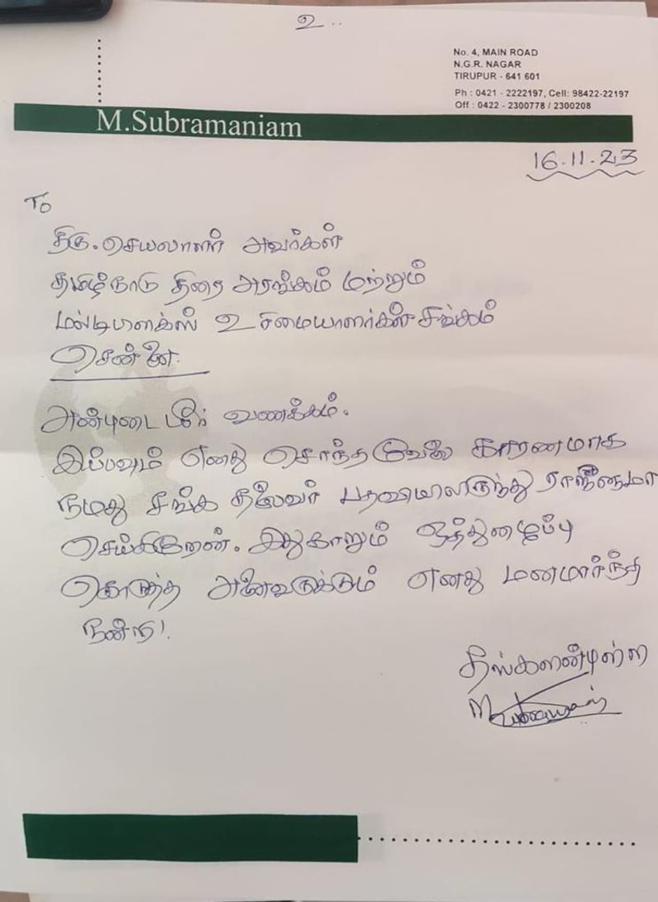 கோவை, ஈரோடு, திருப்பூர் மாவட்ட திரை அரங்கு உரிமையாளர் சங்க தலைவர் பதவியில் இருந்து சக்தி பிலிம்ஸ் சுப்பிரமணியம் ராஜினாமா. செய்வதாக அறிவித்துள்ளது அதிர்ச்சியை ஏற்பஉடுத்தியுள்ளது.