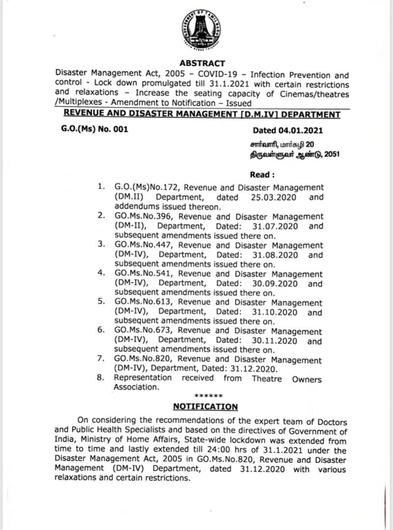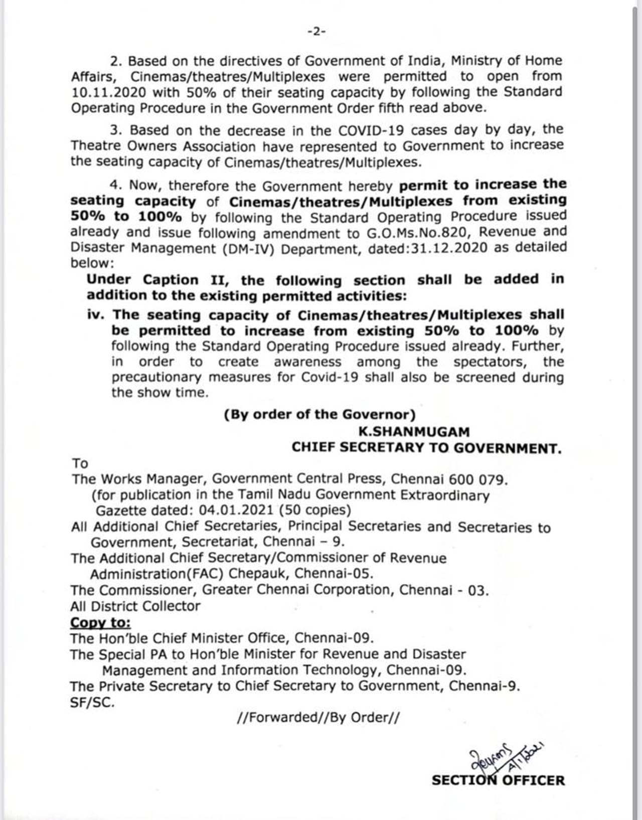 தற்போது தமிழக அரசு தியேட்டர்களில் 100 சதவீத பார்வையாளர்களுக்கு அனுமதி அளித்து அரசாணை வெளியிடப்பட்டுள்ளது.