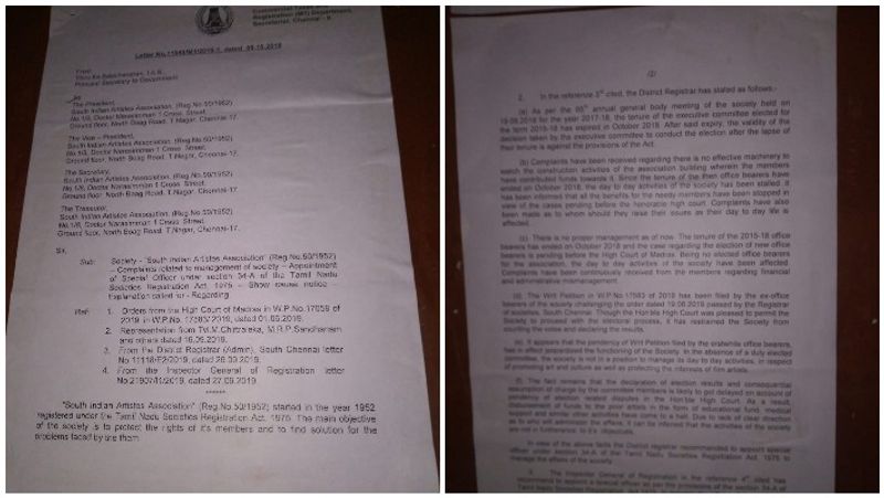 தயாரிப்பாளர் சங்கத்தில் நடந்த குழப்பங்களைப் பயன்படுத்தி அச்சங்கத்தை தனி அதிகாரி நியமித்து முடக்கியது போல நடிகர் சங்கத்தையும் முடக்கும் பெரும் அதிர்ச்சிகரமான முடிவை தமிழக அரசு எடுத்துள்ளதாகத் தெரிகிறது.அதன் துவக்க அறிகுறியாக தென்னிந்திய நடிகர் சங்கத் தலைவர் நாசர், மற்றும் செயலாளர் விஷாலுக்கு பதிவுத் துறை நோட்டீஸ் அனுப்புள்ளது.