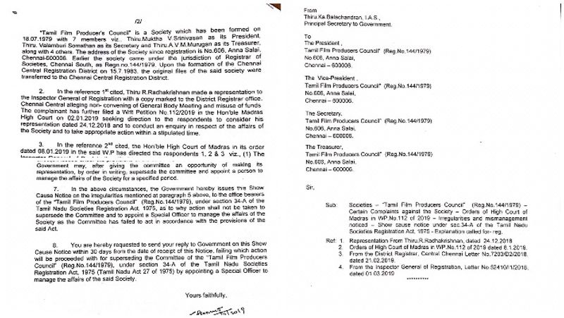 இந்நிலையில், சட்டப்படி உங்களுக்கு விளக்கம் அளிக்க ஒரு வாய்ப்பு தரப்படுகிறது. எனவே, சிறப்பு அதிகாரி ஒருவரை அரசே நியமித்து உங்கள் சங்கத்தின் மேலாண்மை விவகாரங்களை ஏன் எடுத்துக் கொள்ளக் கூடாது என்பதற்கு இன்னும் 30 நாட்களுக்குள் நீங்கள் விளக்கம் அளிக்க வேண்டும். இல்லாவிட்டால், உங்களது சங்கத்தை நிர்வகிக்க அரசுத் தரப்பில் இருந்து சிறப்பு அதிகாரி ஒருவர் நியமிக்கப்பட்டு சங்கத்தின் மேலாண்மை அதிகாரம் தமிழக அரசால் எடுத்துக் கொள்ளப்படும்..” இவ்வாறு அந்த நோட்டீஸில் கூறப்பட்டுள்ளது.