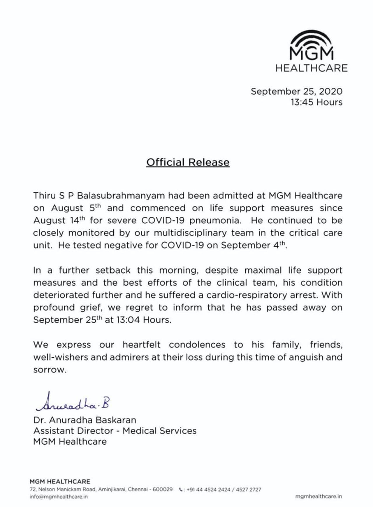 தற்போது எஸ்.பி.பி. உயிர் பிரிந்தது குறித்து மருத்துவமனை நிர்வாகம் சார்பில் அறிக்கை ஒன்று வெளியிடப்பட்டுள்ளது.