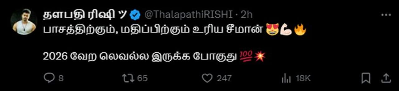 ஆனால் நாம் தமிழர் கட்சி தலைமை ஒருங்கிணைப்பாளர் சீமான் அவர்களுக்கு நன்றி தெரிவிக்கும் போதுமட்டும், பாசத்திற்கும், மதிப்பிற்கும் உரிய திரு. செந்தமிழ் சீமான் அவர்களுக்கு நன்றி என்று குறிப்பிட்டிருந்தார். போதுமே.. இதை கண்ட நெட்டிசன்கள் சும்மா இருப்பார்களா? விஜயின் இந்த பதிவிற்கு பிறகு பல யுகங்களை கிளப்ப துவங்கியுள்ளனர் நெட்டிசன்கள்.