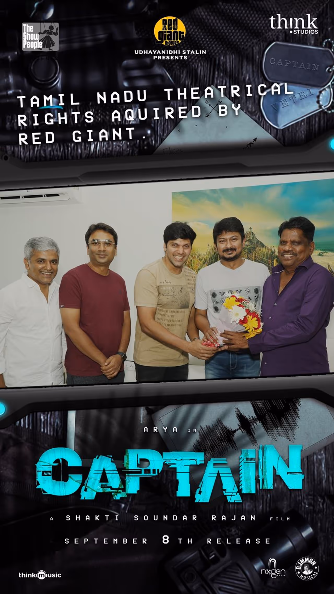 அதன்படி சக்தி சவுந்தரராஜன் இயக்கத்தில் ஆர்யா நடிப்பில் உருவாகி உள்ள கேப்டன் படத்தின் தமிழக வெளியீட்டு உரிமையை உதயநிதியின் ரெட் ஜெயண்ட் மூவீஸ் நிறுவனம் கைப்பற்றி உள்ளது. மேலும் இப்படம் வருகிற செப்டம்பர் மாதம் 8-ந் தேதி திரையரங்குகளில் ரிலீசாக உள்ளதாகவும் அறிவிக்கப்பட்டு உள்ளது.