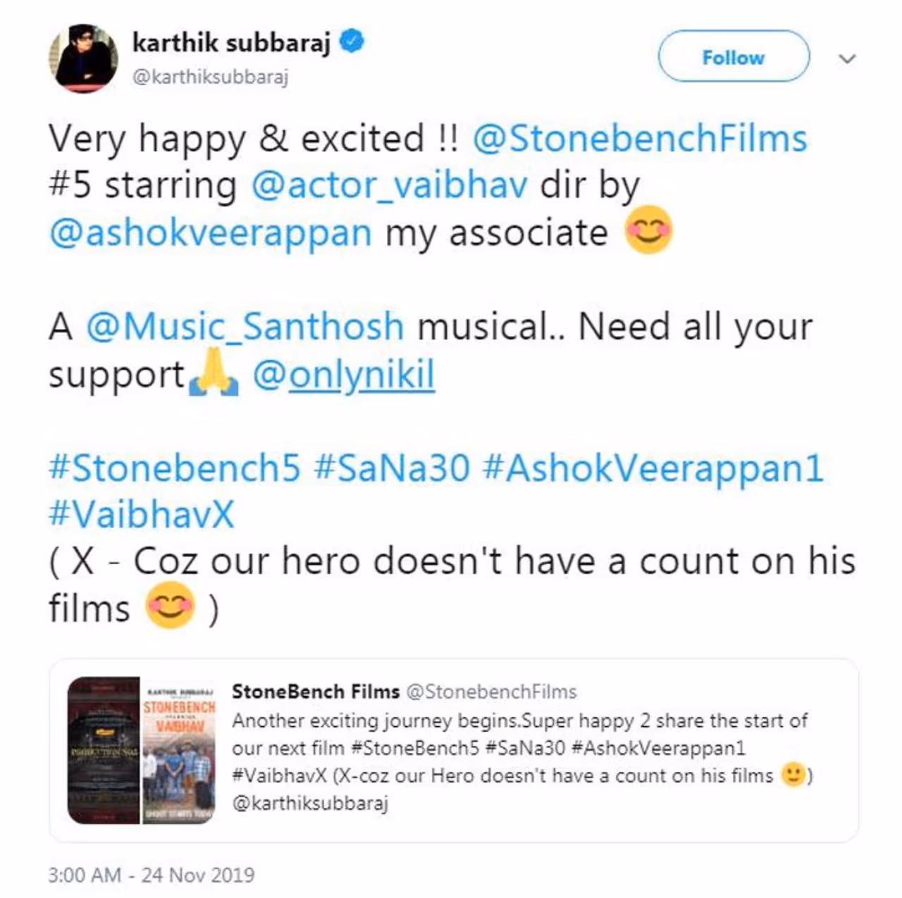 புதிய படம் குறித்த மகிழ்ச்சிக்குரிய அறிவிப்பை தனது டுவிட்டர் பக்கத்தில் வெளியிட்டிருக்கும் கார்த்திக் சுப்பராஜ், ஸ்டோன் பெஞ்ச்சின் 5-வது படமாகவும், இசையமைப்பாளர் சந்தோஷ் நாராயணின் 30-வது படமாகவும், இயக்குநர் அசோக் வீரப்பனின் அறிமுகப்படமாகவும் உருவாகும் இந்தப் படத்துக்கு தங்கள் அனைவரின் ஆதரவும் தேவை என பதிவிட்டுள்ளார்.