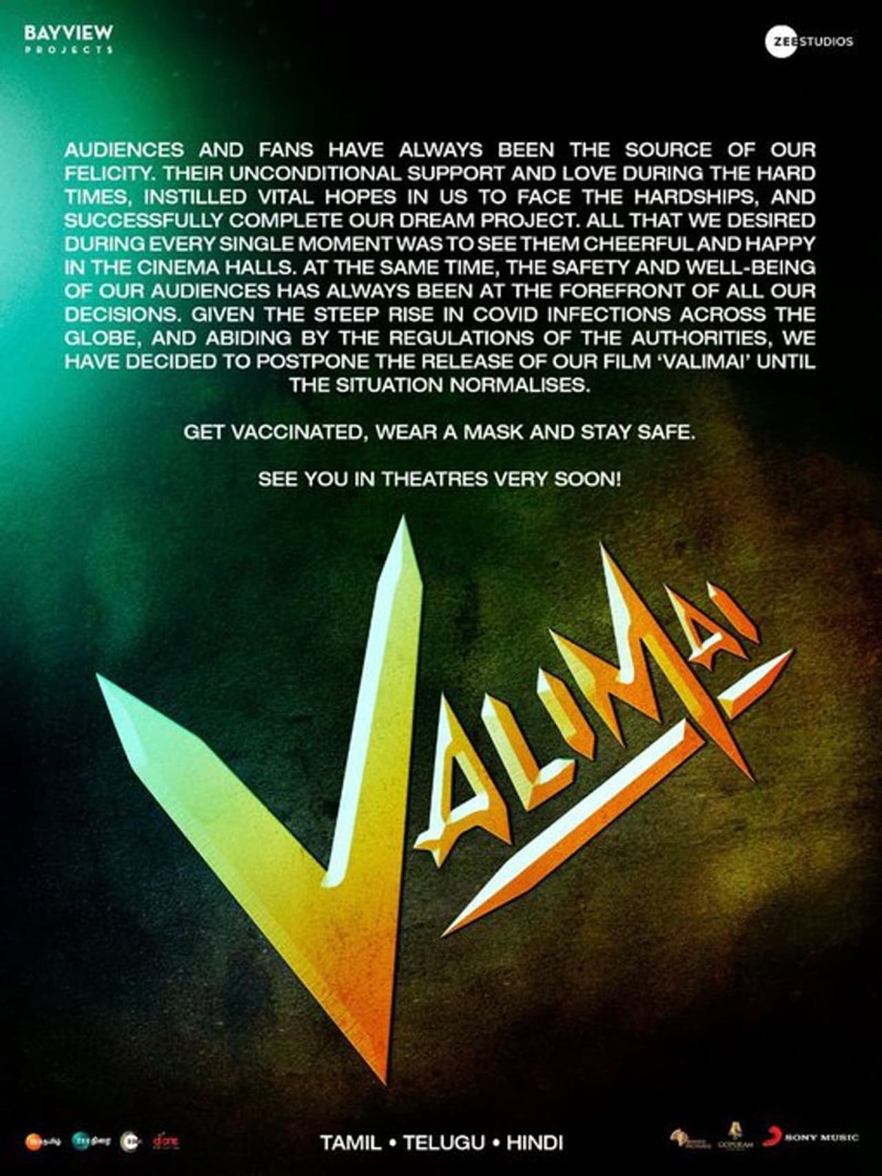 valimai postponed : கொரோனா பரவல் காரணமாக ஊரடங்கு மற்றும் திரையரங்குகளுக்கு கட்டுப்பாடு விதிக்கப்பட்டுள்ளது. இதனால் வலிமை ரிலீஸை ஒத்தி வைப்பதாக படக்குழு அறிவித்துள்ளது. இந்த தகவல் ரசிகர்களை பெரும் சோகத்தில் ஆழ்த்தியுள்ளது.