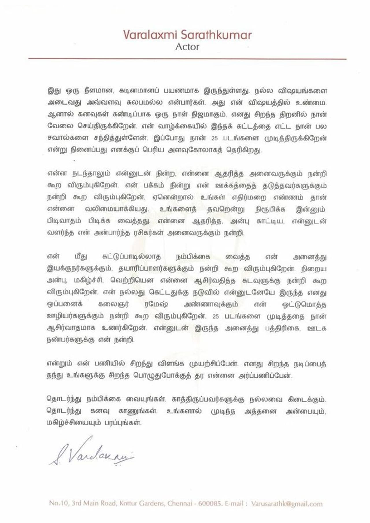 நடிகை வரலட்சுமி சரத்குமார், வெற்றிகரமாக 25 படங்களை நடித்து முடித்துள்ளதற்கு, நன்றி கூறும் விதமாக தற்போது அறிக்கை ஒன்றை வெளியிட்டு, நன்றி தெரிவித்துள்ளார்.