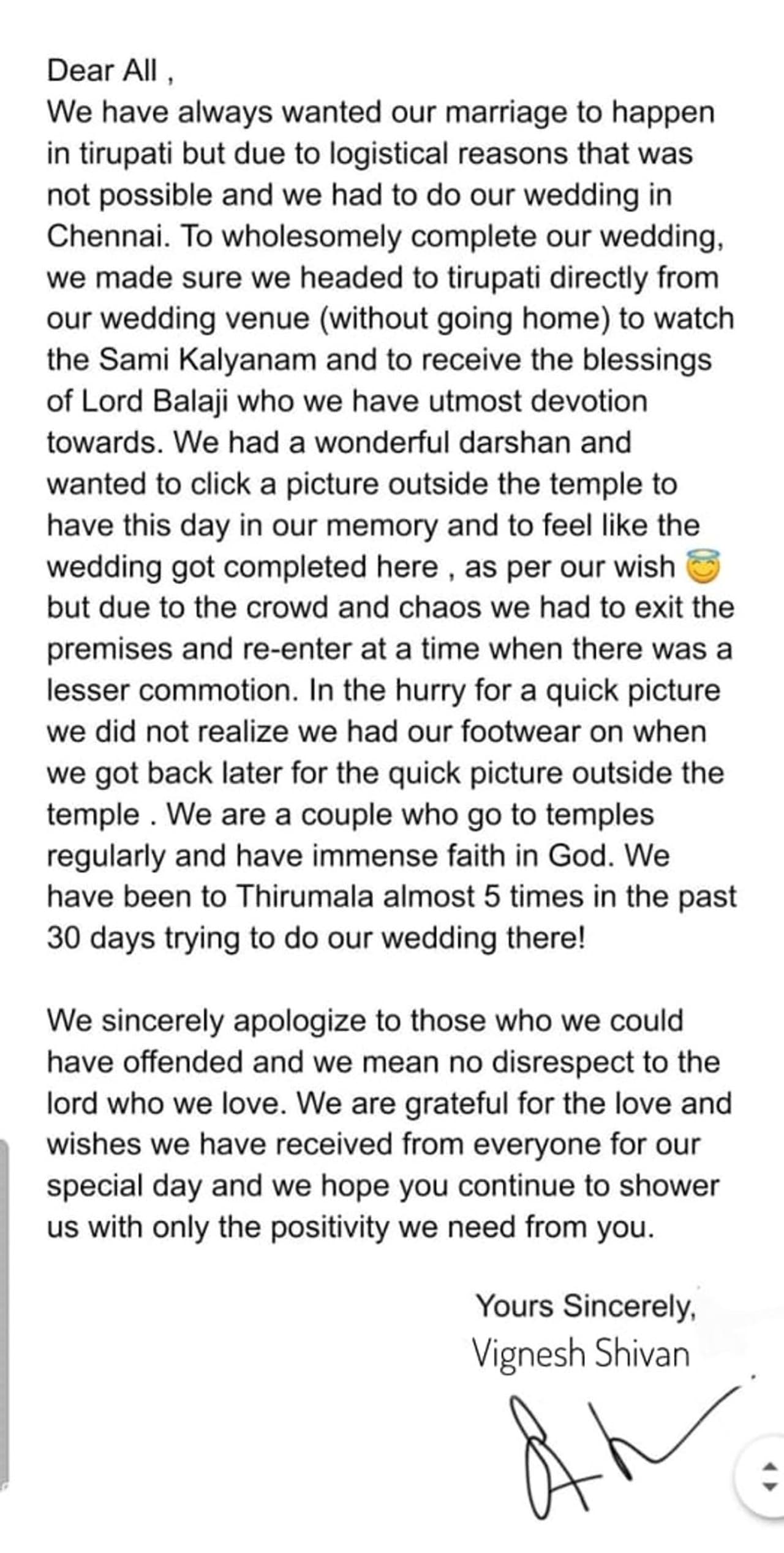 இந்த நாள் எங்கள் நியாபகமாக இருக்க வேண்டும் என்பதற்காக கோயிலுக்கு வெளியே ஒரு புகைப்படம் எடுத்து அதை எங்கள் விருப்பப்படி இங்கே திருமணம் முடிந்துவிட்டது என்று உணர்வை பெற விரும்பினோம், ஆனால் கூட்டம் மற்றும் குழப்பம் காரணமாக நாங்கள் வளாகத்தை விட்டு வெளியேற வேண்டியிருந்தது. பின்னர் சலசலப்பு குறைந்த நேரத்தில் உள்ளே நுழைந்து விரைந்து படம் எடுக்கும் அவசரத்தில், நாங்கள் எங்கள் காலணிகளை அணிந்திருந்ததை உணரவில்லை. நாங்கள் தொடர்ந்து கோவில்களுக்குச் செல்லும் தம்பதிகள், கடவுள் மீது அபரிமித நம்பிக்கை கொண்டவர்கள். கடந்த 30 நாட்களில் கிட்டத்தட்ட 5 முறை திருமலைக்குச் சென்று திருமணத்தை அங்கே நடத்த முயற்சித்தோம். எங்களால் புண்படுத்தப்பட்டவர்களிடம் நாங்கள் உண்மையாக மன்னிப்பு கேட்டுக்கொள்கிறோம். மேலும் நாங்கள் நேசிக்கும் இறைவனுக்கு எந்த அவமரியாதையும் இல்லை. எங்கள் சிறப்பு நாளுக்காக அனைவரிடமிருந்தும் நாங்கள் பெற்ற அன்பு மற்றும் வாழ்த்துக்களுக்கு நாங்கள் நன்றியுள்ளவர்களாக இருக்கிறோம். மேலும் உங்களிடமிருந்து எங்களுக்குத் தேவையான நேர்மறையை மட்டுமே நீங்கள் தொடர்ந்து எங்களுக்கு வழங்குவீர்கள் என்று நம்புகிறோம் என்று தெரிவித்துள்ளார்.