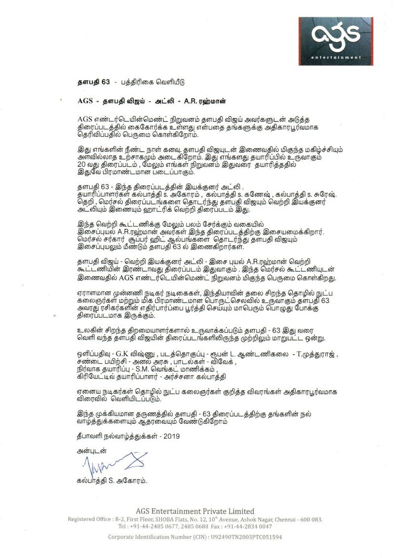 இந்த படத்தை தொடர்ந்து விஜய் மூன்றாவது முறையாக இயக்குனர் அட்லீ இயக்கத்தில் தன்னுடைய 63வது படத்தை நடிக்க உள்ளார்.