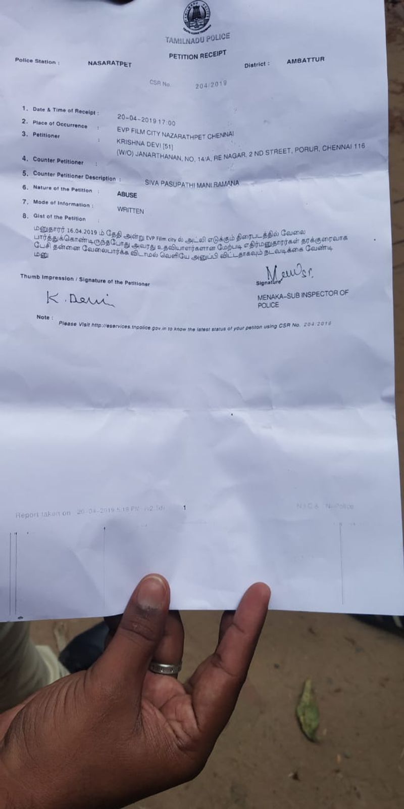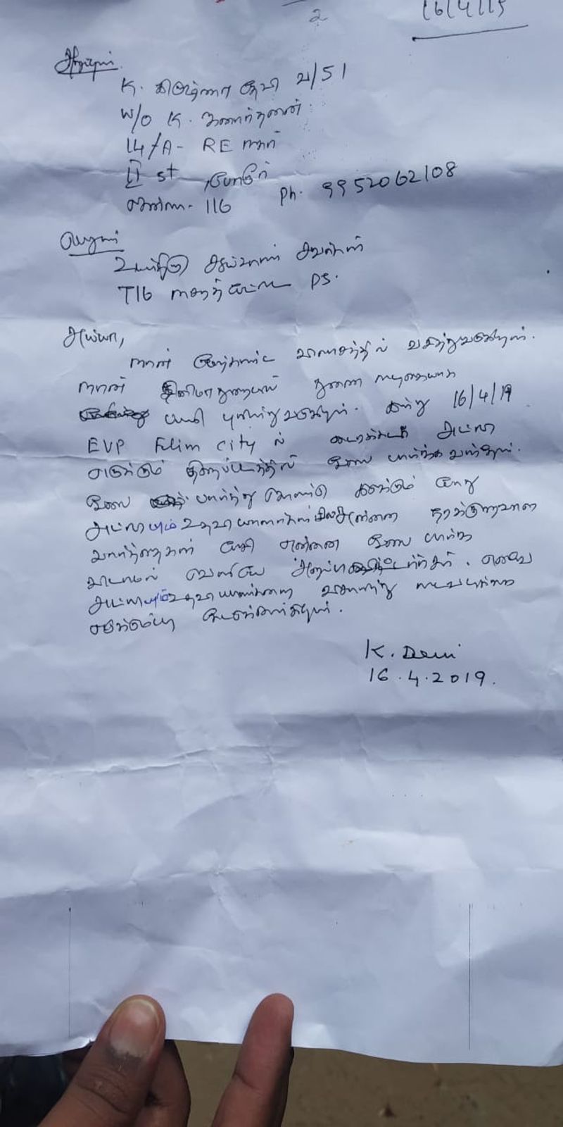 இதில் கூறியிருப்பதாவது... " நான் சினிமா துறையில் துணைநடிகையாக பணிபுரிந்து வருகிறேன். 16 .4 .19 அன்று EVP பிலிம் சிட்டியில் நடந்து வரும் இயக்குனர் அட்லீயின் திரைப்படத்தில் வேலை பார்க்க வந்தேன்.