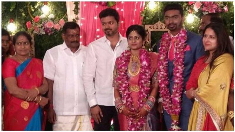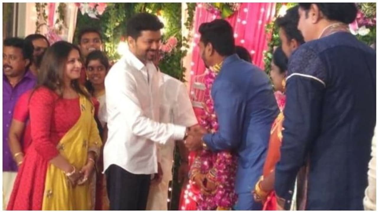 தன்னிடம் நீண்டகாலமாக கார் டிரைவராகப் பணியாற்றி வரும் ராஜேந்திரன் என்பவரின் மகள் திருமண வரவேற்புக்கு நடிகர் விஜய் தனது மனவியுடன் கலந்துகொண்டு வாழ்த்திய புகைப்படம் வலைதளங்களில் வைரலாகி வருகிறது.