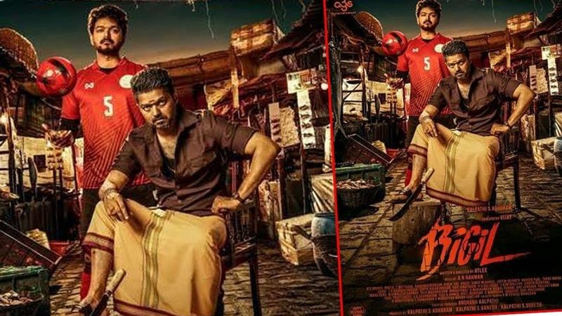 அதன்படி ஃபர்ஸ்ட் லுக் நேற்று மாலை 6 மணிக்கு வெளியானது. தந்தை, மகன் என்று இரண்டு கேரக்டர்கள் படத்தில் இருப்பதை உறுதி செய்யும் விதமாக ஃபர்ஸ்ட் லுக் இருந்தது. படத்துக்கு ‘பிகில்’ என்று பெயரிடப்பட்டுள்ளது.