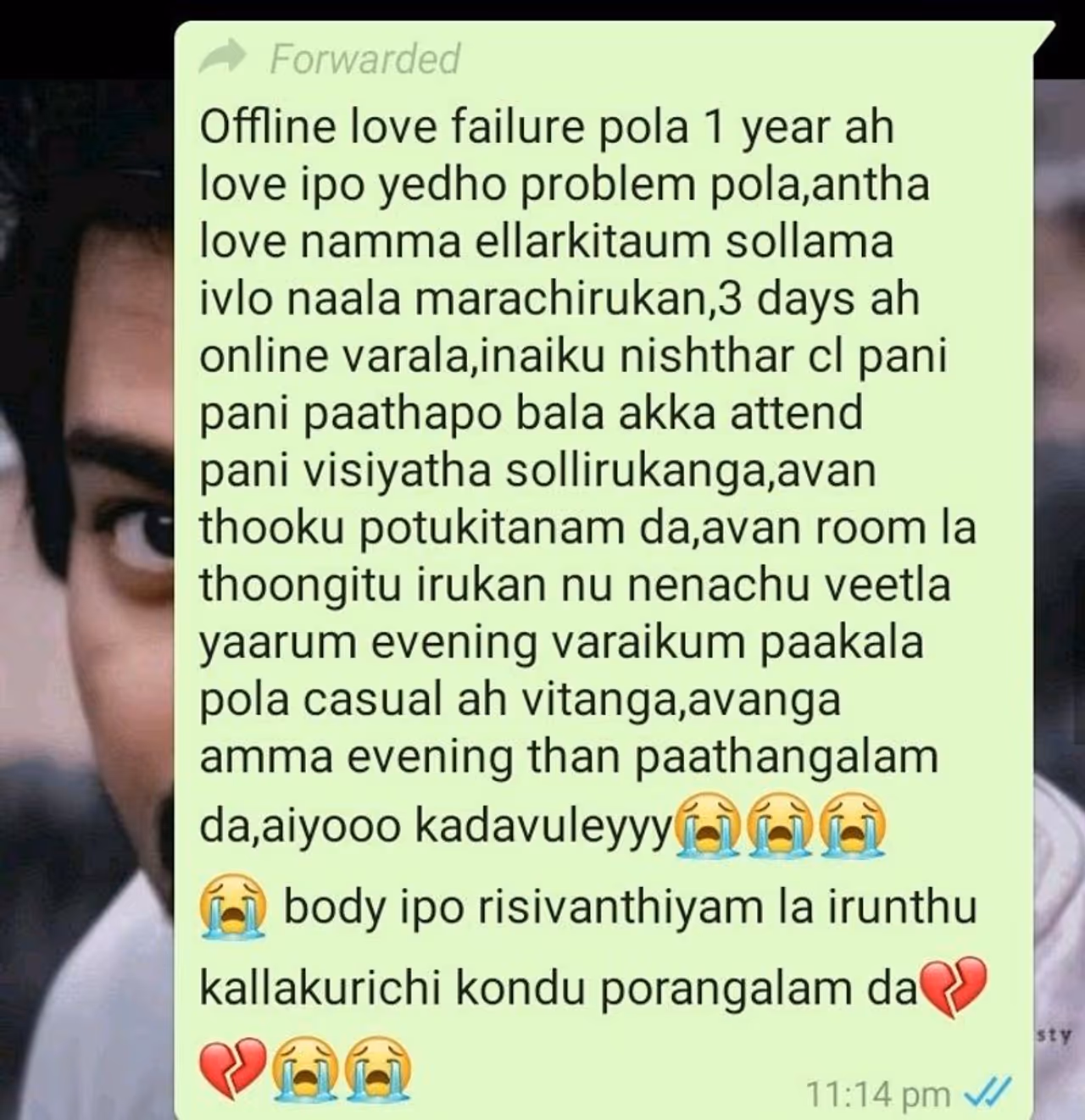 அதனால் தற்கொலை செய்து கொள்கிறேன் என ட்விட்டர் பக்கத்தில் தெரிவித்து விட்டு, கடைசி வரை தளபதியையும், மாஸ்டரையும் பார்க்காமலே போகிறேன் என தூக்கிட்டு தற்கொலை செய்துகொண்டுள்ளார். இந்த பதிவும், பாலாவின் இழப்பும் விஜய் ரசிகர்கள் மட்டும் இன்றி அணைத்து தரப்பினரையும் சோகத்தில் ஆழ்த்தியுள்ளது.