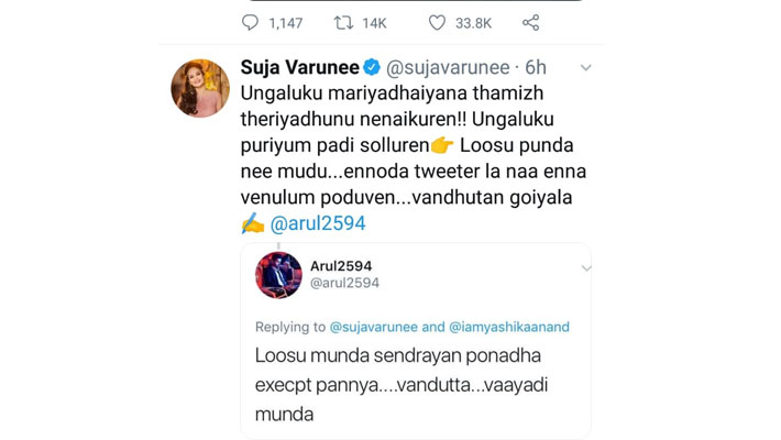 இந்த நிலையில் யாஷிகா பிக்பாஸ் வீட்டில் இருந்து ஞாயிறன்று வெளியேறினார். இதற்கும் யாஷிகா வீட்டில் இருந்து வெளியேறியதை தன்னால் ஏற்க முடியவில்லை என்கிற ரீதியில் சுஜா ட்விட்டரில் எழுதியிருந்தார். சுஜாவின் இந்த ட்வீட்டிற்கு விஜய் ரசிகரான அருள் என்பவர் ஒருமையில் பதில் அளித்திருந்தார். மேலும் மு…ட என்கிற வார்த்தையை பயன்படுத்தி சுஜாவை அந்த ரசிகர் வசைபாடியிருந்தார்.