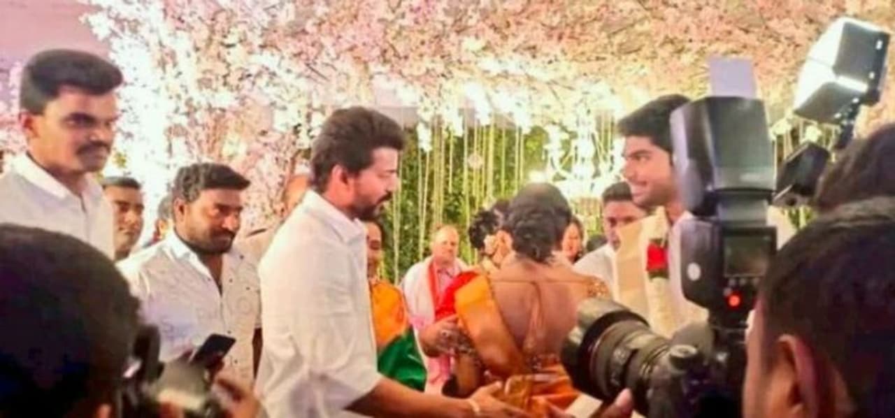 விஜய் பிரபல தயாரிப்பாளர் ஐசரி கணேஷ் பக்கத்தில் அமர்ந்திருப்பது போன்றும், மணமக்களை வாழ்த்துவது போன்றும், குழந்தையுடன் செல்பி எடுத்து கொண்டது போன்றும் புகைப்படங்கள் சமூக வலைத்தளத்தில் வைரலாகி வருகிறது.