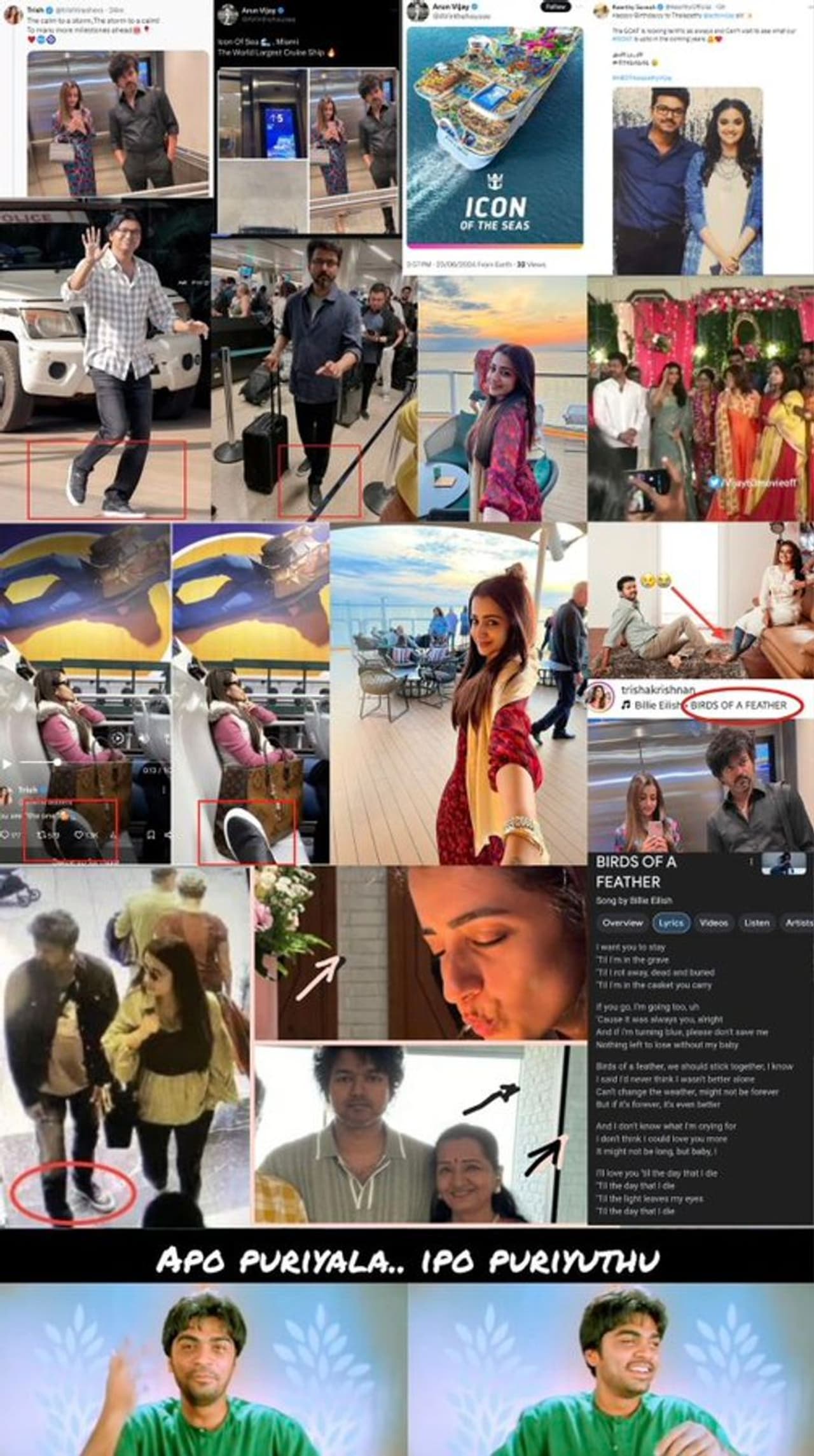இந்த நிலையில் த்ரிஷா மற்றும் விஜய் இருக்கும் பழைய படங்களை நெட்டிசன்கள் தோண்ட அதில் விஜய் தனியாக நடக்கும் போது ஒரு போட்டோவு, த்ரிஷா பக்கத்தில் ஒரு கால் இருக்கும் போட்டோவும் இணையத்தில் வைரலானது. விஜய் அணிந்திருந்த அதே ஷூ வை, த்ரிஷா அருகில் அமர்ந்திருக்கும் காலிலும் உள்ளது. இதனால் விஜய்யும் த்ரிஷாவும் அடிக்கடி வெளிநாடு சென்றுள்ளனர் என்று பலரும் கருத்து பதிவிட்டு வருகின்றனர்.