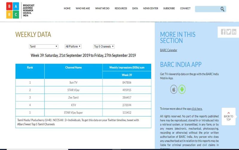 முதலிடத்தில் சன் டிவி இருக்கிறது. இந்த வாரம் பிக் பாஸ் நிகழ்ச்சி இறுதி கட்டம் என்பதால் டி.ஆர்.பி ரேட்டிங் உயரும் என நம்பிக்கையில் இருக்கிறது விஜய் டி.வி.