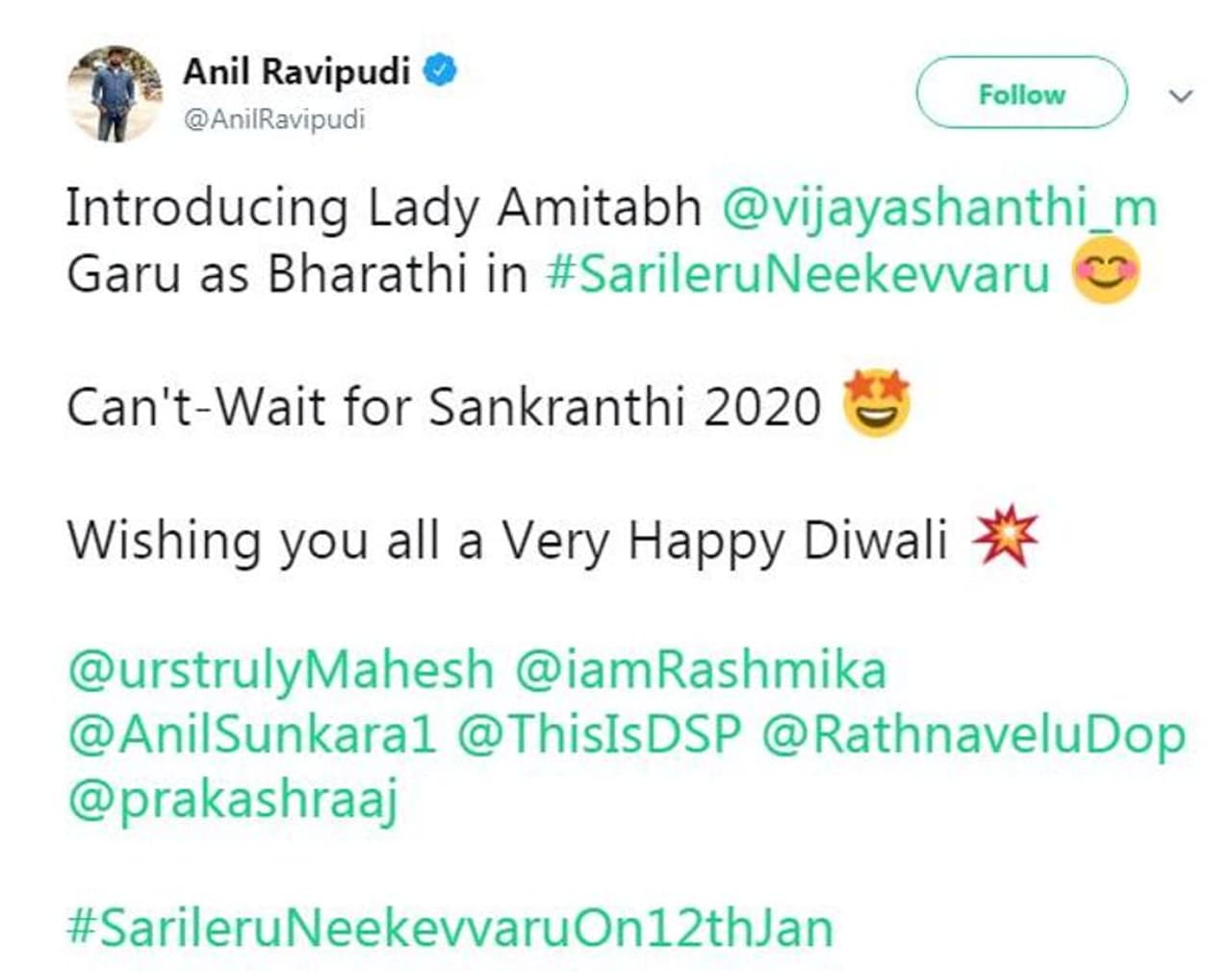 இந்தப் படத்தின் மூலம் 13 ஆண்டுகளுக்குப் பிறகு மீண்டும் அவர், திரையில் ஜொலிக்க உள்ளார். வரும் சங்கராந்திக்கு 'சரிலேறு நீக்கெவரு' ரிலீஸ் என அறிவிக்கப்பட்டுள்ள நிலையில், தீபாவளி பண்டிகையை முன்னிட்டு, விஜயசாந்தியின் ஃபர்ஸ்ட் லுக்கை வெளியிட்டு படக்குழு இன்ப அதிர்ச்சி அளித்துள்ளது.