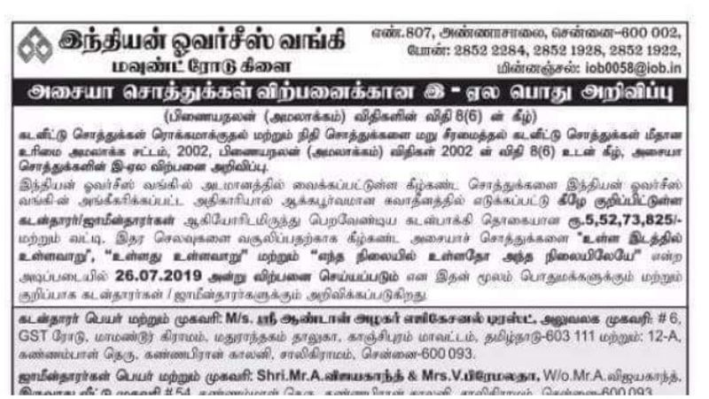 இந்நிலையில் இந்தியன் ஓவர்சீஸ் வங்கியில் வாங்கிய கடனுக்காக விஜயகாந்தின் ரூ.100 கோடி சொத்துகள் ஏலத்துக்கு வர இருப்பதாக அறிவிக்கப்பட்டுள்ளது. இந்த வங்கியில்,