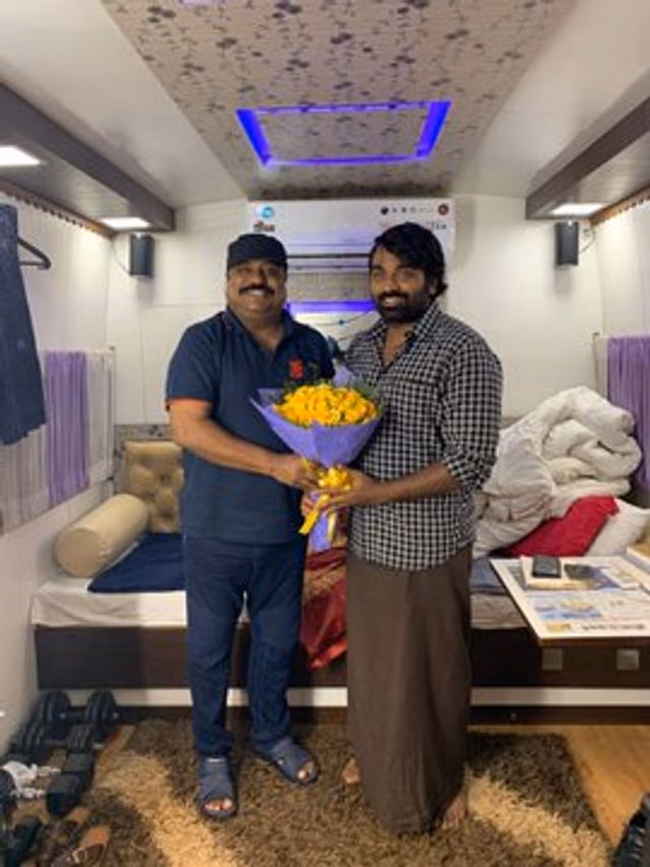 படத்தின் இறுதிக்கட்ட வேலைகள் பரபரப்பாக சென்று கொண்டிருக்கும் சமயத்தில், படக்குழுவினரை சந்தித்த சேவியர் பிரிட்டோ மலர் கொத்து கொடுத்து வாழ்த்து தெரிவித்துள்ளார். அந்த புகைப்படங்களை சேவியர் பிரிட்டோ தனது டுவிட்டர் பக்கத்தில் பதிவிட்டுள்ளார். அதன் மூலம் மாஸ்டர் படத்தில் நடித்து வரும் விஜய் சேதுபதியின் ஃபுல் லுக் சோசியல் மீடியாவில் வெளியாகி வைரலாகி வருகிறது.