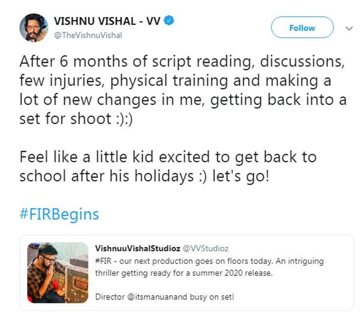 இந்த மகிழ்ச்சிக்குரிய தகவலை தனது டுவிட்டர் பக்கத்தில் பகிர்ந்துள்ள விஷ்ணு விஷால், "கதை விவாதங்கள், சில காயங்கள், உடற்பயிற்சி மற்றும் என்னுள் நிறைய புதிய மாற்றங்களுடன் 6 மாதங்களுக்குப் பிறகு மீண்டும் படப்பிடிப்பில்..!" என குறிப்பிட்டுள்ளார்.