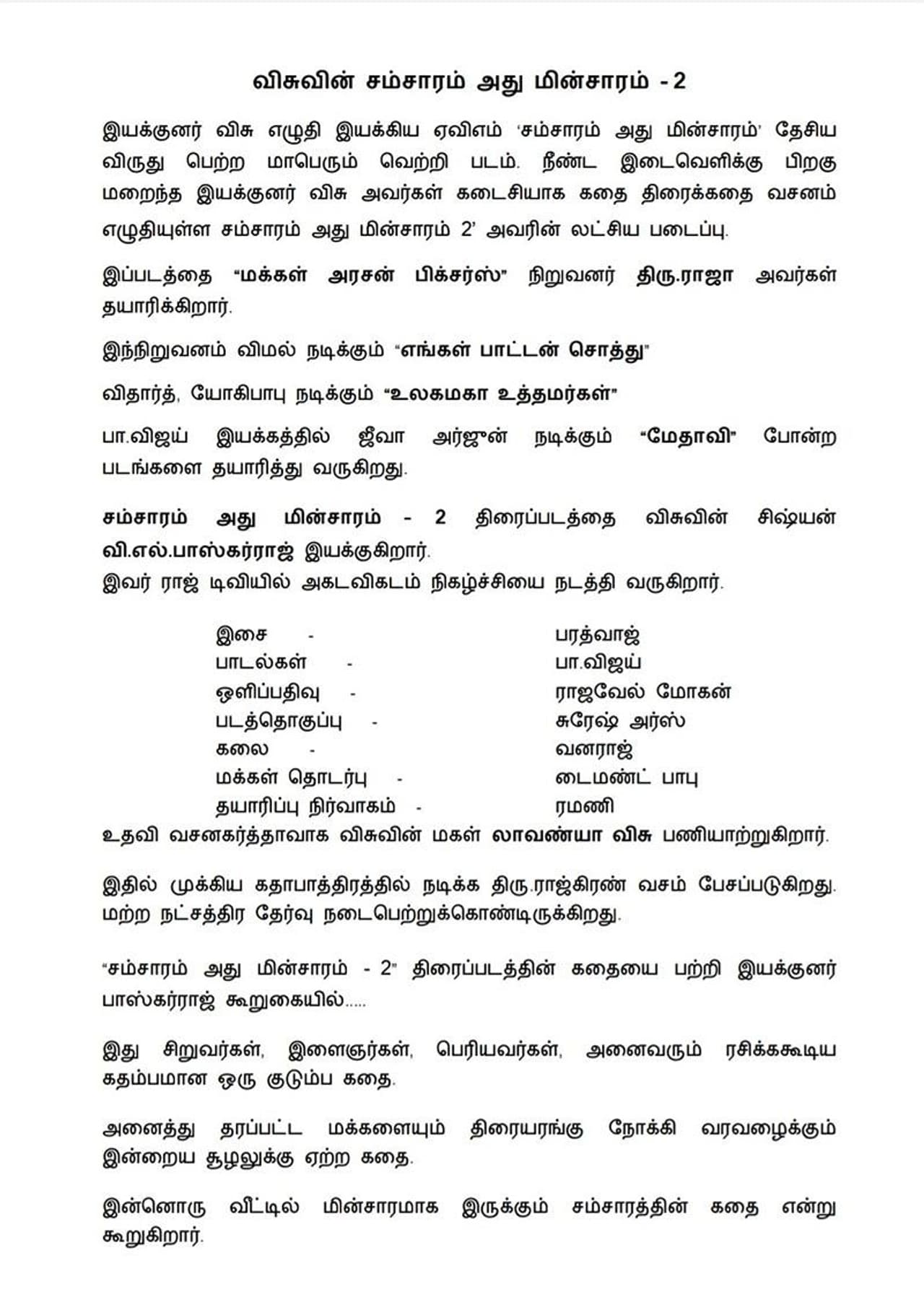 மேலும் இந்த படத்தின் உதவி வசனகர்த்தாவாக விசுவின் மகள் லாவண்யா விசு பணியாற்றுகிறார். இதில் முக்கிய கதாபாத்திரத்தில் நடிக்க திரு.ராஜ்கிரண் வசம் பேசப்படுகிறது. மற்ற நட்சத்திர தேர்வு நடைபெற்றுக்கொண்டிருக்கிறது. “சம்சாரம் அது மின்சாரம் - 2: திரைப்படத்தின் கதையை பற்றி இயக்குனர் பாஸ்கர்ராஜ் கூறுகையில், ‘இது சிறுவர்கள், இளைஞர்கள், பெரியவர்கள், அனைவரும் ரசிக்ககூடிய கதம்பமான ஒரு குடும்ப கதை. அனைத்து தரப்பட்ட மக்களையும் திரையரங்கு நோக்கி வரவழைக்கும் இன்றைய சூழலுக்கு ஏற்ற கதை’ என்று கூறியுள்ளார்.