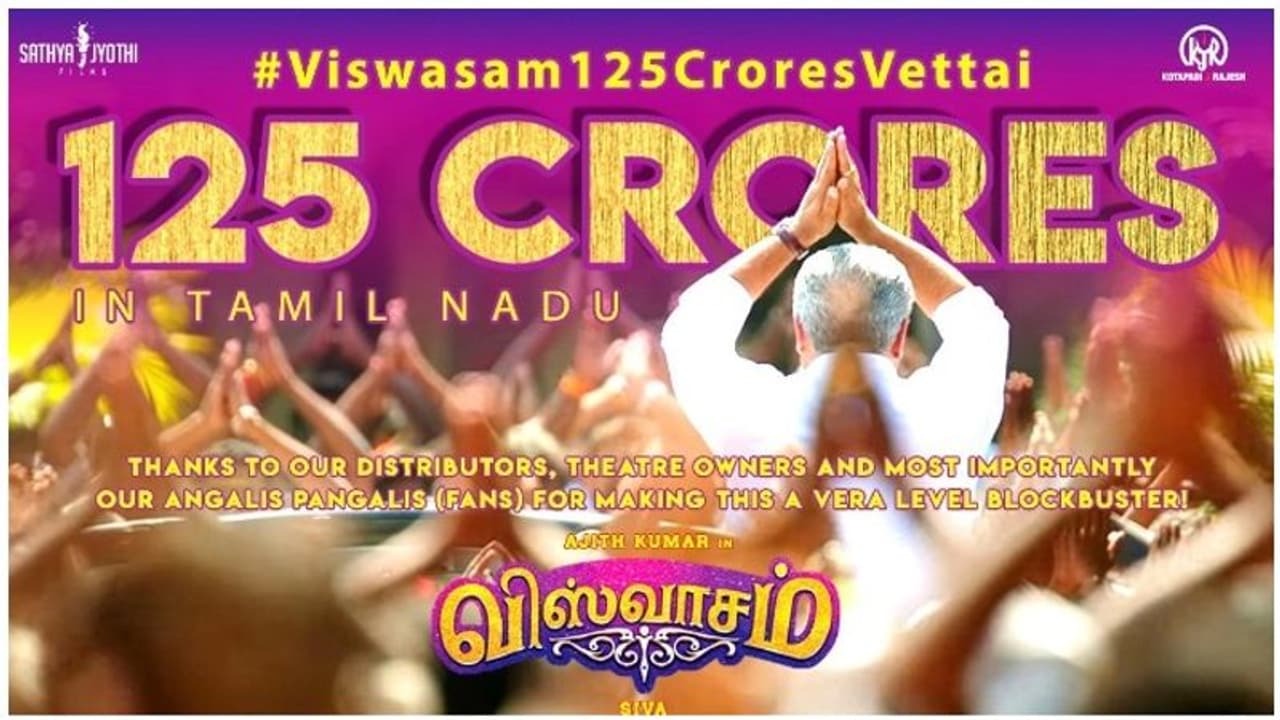 சத்யஜோதி ஃபிலிம்ஸ் தயாரிப்பில் கடந்த பொங்கலுக்கு வெளியான ‘விஸ்வாசம்’மாபெரும் ஹிட் என்று படத்தை வெளியிட்ட கே.ஜே.ஆர் ஸ்டுடியோஸ் படம் வெளியான சமயத்தில் தெரிவித்தது.அப்போது மொத்த வசூலான தொகை 125 கோடி என்றும் தனது ட்விட்டர் பக்கத்தில் அதிகாரபூர்வமாக அறிவித்திருந்தது. அந்த ட்விட்டை வைரலாக்கி அஜீத் ரசிகர்கள் கொண்டாடித் தீர்த்தனர்.