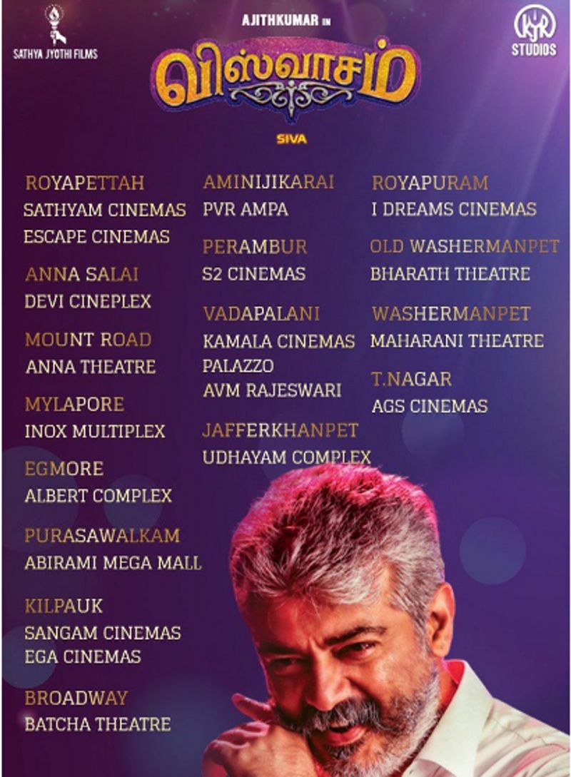 இந்த நிலையில் 'விஸ்வாசம்' படத்தை வெளியிடும் சென்னை திரையரங்குகள் குறித்த பட்டியல் தற்போது தெரியவந்துள்ளது.