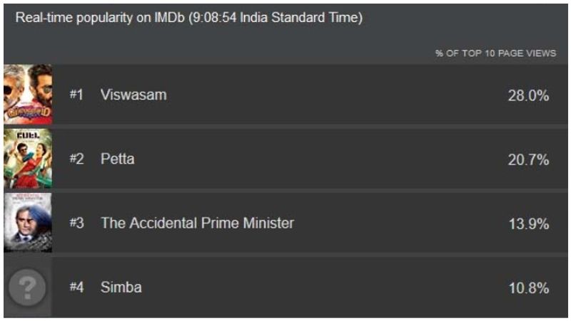 இந்நிலையில் இந்திய அளவில் அதிகம் எதிர்பார்க்கப்படும் ட்ரெண்டிங் படங்களின் வரிசையில் நேற்று முதலிடத்தில் இருந்த ‘பேட்ட’ மற்றும் சில இந்திப்படங்களை அடித்து நொறுக்கி முதலிடத்தை அடைந்திருக்கிறது அஜீத்தின் ‘விஸ்வாசம்’.