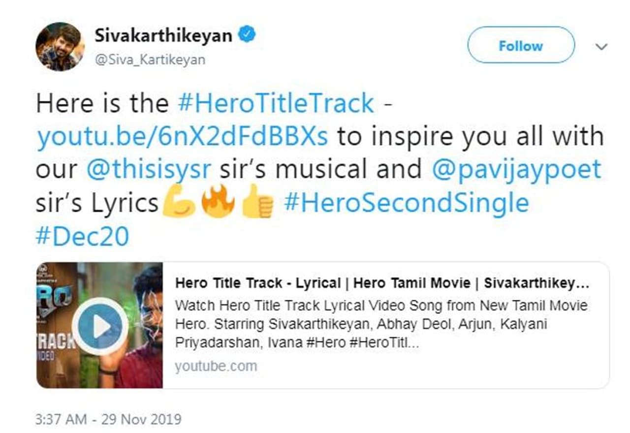 அதைத் தொடர்ந்து, படத்தின் செகண்ட் சிங்கிள் ட்ராக்கான 'ஹீரோ' பாடல் இன்று (நவ.29) வெளியாகியுள்ளது. இதனை, சிவகார்த்திகேயனே தனது டுவிட்டர் பக்கத்தில் வெளியிட்டுள்ளார்.ஹீரோவுக்கான அடையாளத்தை கூறும் விதமாக அமைந்துள்ள இந்தப் பாடலை, கவிஞர் பா.விஜய் எழுதியுள்ளார்.
