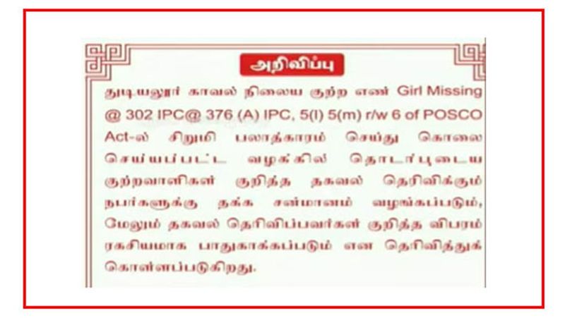 இதனிடையே இந்த கொலையில் தொடர்புடையவர்களை பிடிக்க 10 தனிப்படைகள் அமைக்கப்பட்டது. ஆனால் எந்த முன்னேற்றமும் இதுவரை ஏற்படவில்லை. இந்நிலையில் இச்சம்பவம் தொடர்பாக துப்புக் கொடுத்தால் சன்மானம் வழங்கப்படும் என்று காவல்துறை தரப்பில் அறிவிக்கப்பட்டுள்ளது. இது தொடர்பாக நோட்டீஸ் அச்சடித்துள்ள காவல்துறை, அதை அந்த பகுதியில் ஒட்டி வருகின்றனர். தகவல் தெரிவிப்பவர்கள் விவரங்கள் ரகசியம் காக்கப்படும் என தெரிவிக்கப்பட்டுள்ளது.