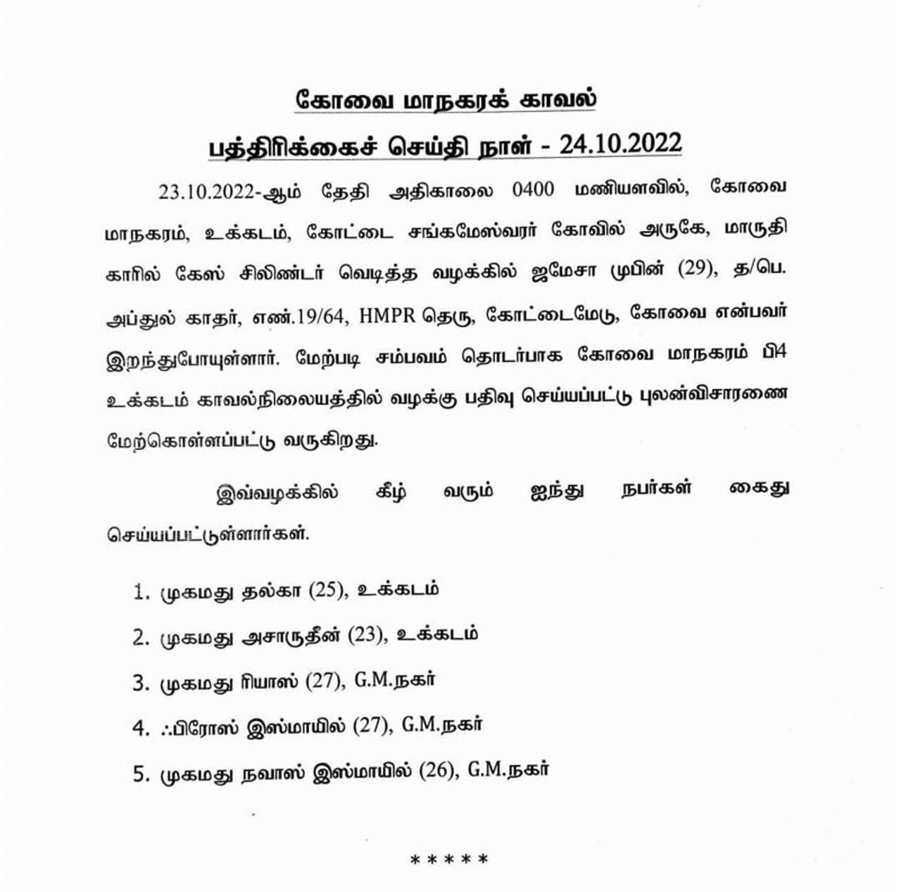 கோயம்புத்தூரில் காரில் கேஸ் சிலிண்டர் வெடிப்பு சம்பவம் தொடர்பாக 5 பேரை போலீசார் அதிரடியாக கைது செய்து ரகசிய இடத்தில் வைத்து விசாரணை நடத்தி வருகின்றனர்.