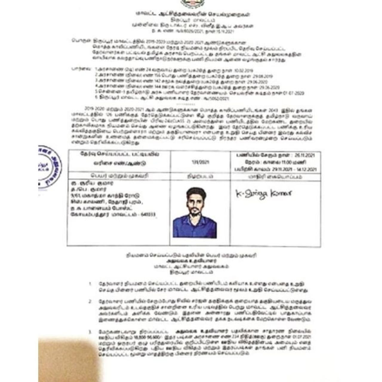 திருப்பூர் மாவட்ட கலெக்டர் பெயரில் போலி பணி நியமன ஆணை கொடுத்து பல லட்சங்களை சுருட்டிய திருடனை தேடி வருகின்றனர்.