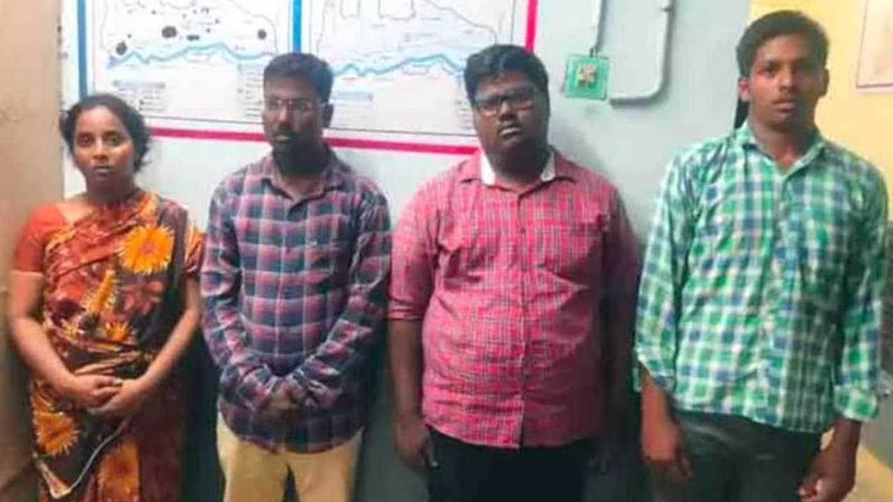 உடனடியாக விக்னேஷ்வரனுடன் சேர்ந்து மோட்டார்சைக்கிளையும், லோகநாதனின் உடலையும் அங்கு இருந்த மைல் கல் அருகே விபத்து நடந்தது போன்று போட்டுவிட்டு நாடகமாடி உள்ளனர். இதைத்தொடர்ந்து லோகநாதனை கொலை செய்ததாக அவருடைய மனைவி மகேஷ்வரி, அவருடைய கள்ளக்காதலன் கவுரிசங்கர், கவுரிசங்கரின் தம்பி விஜய், விக்னேஷ்வரன் ஆகியோரை பங்களாப்புதூர் போலீசார் கைது செய்தனர். லோகநாதனின் உடலை கொண்டு சென்ற சரக்கு வேனையும் பறிமுதல் செய்தனர்.