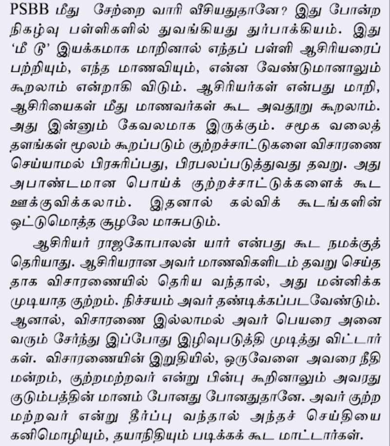 ஆசிரியர் ராஜகோபாலன் யார் என்பது கூட நமக்குத் தெரியாது. ஆசிரியரான அவர் மாணவிகளிடம் தவறு செய்ததாக விசாரணையில் தெரிய வந்தால், அது மன்னிக்க முடியாத குற்றம். நிச்சயம் அவர் தண்டிக்கப்பட வேண்டு. ஆனால், விசாரணை இல்லாமல் அவர் பெயரை அனைவரும் சேர்ந்து இப்போது இழிவுபடுத்தி முடித்து விட்டார்கள். விசாரணையின் இறுதியில் ஒருவேளை அவரை நீதிமன்றம், குற்றமற்றவர் என்று பின்பு கூறினாலும் அவரது குடும்பத்தின் மானம் போனதுபோனதுதானே. அவர் குற்றமற்றவர் என்று தீர்ப்பு வந்தால் அந்த செய்தியை கனிமொழியும், தயாநிதியும் படிக்கக்கூட மாட்டார்கள்’’ என விமர்சனம் வெளியிடப்பட்டுள்ளது. .