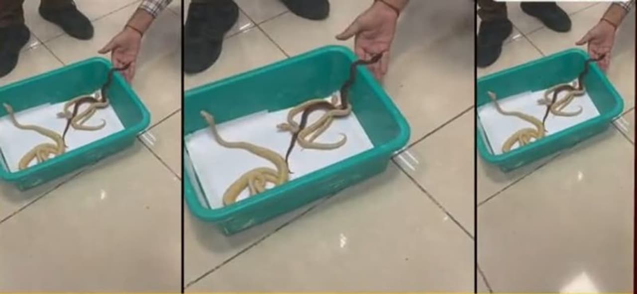 அப்போது அந்த வாலிபர் முன்னுக்குப்பின் முரணாக பதில் அளித்தார். பின்னர் அவர் வைத்திருந்த அந்த உடமைகளை சோதனை செய்தபோது அதில் பயங்கர விஷம் கொண்டா காட்டு ஜந்துக்கள், வன விலங்குகள் இருந்ததை கண்டு அதிர்ச்சி அடைந்தனர். உடனே வன விலங்கு அதிகாரிகளை வரவழைத்து விஷ ஜந்துக்களை ஆய்வு செய்தனர். அதில் ஒரு குட்டி குரங்கு, 15 ராஜநாகம் குட்டிகள், 5 மலைப் பாம்பு குட்டிகள், இரண்டு ஆமைகள் இருந்தது தெரியவந்தது.